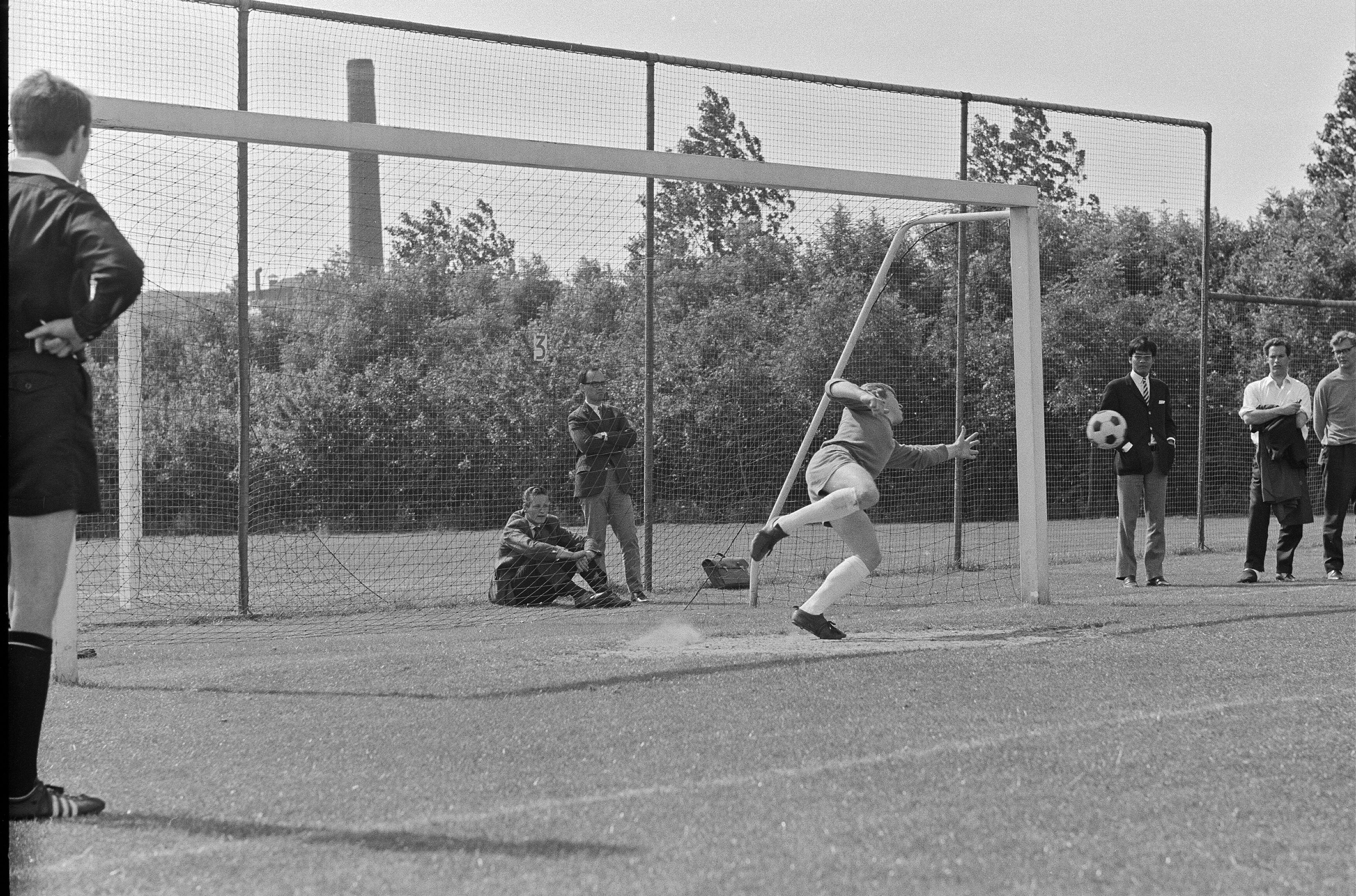 DescriptionOpnamen voetbalwedstrijd O en W voetbal- en volleybaltoernooi 1967 Dit inmiddels tot traditie geworden jaarlijkse sporttoernooi is voor de tweede maal op Delftse bodem gehouden, namelijk op de terreinen van de Studenten Sportstichting aan de Berlageweg. Er moge aan worden herinnerd dat sedert 1952 de voetbalelftallen en later de volleybalteams - samengesteld uit het personeel van de universiteiten en hogescholen elkaar jaarlijks om de door de minister van onderwijs en wetenschappen beschikbaar gestelde wisselbeker plegen te bekampen. In 1952 vond dit sportgebeuren voor het eerst in Delft plaats. Op donderdag 15 juni arriveerden reeds voor 9 uur de eerste deelnemende elftallen en teams met bussen aan de aula. Na binnenkomst van alle deelnemers en supporters verwelkomde de voorzitter van de organisatiecommissie , prof.dr.ir. W.J. Beek, het gezelschap in het groot-auditorium. Na deze begroeting begaf men zich naar de terreinen van de Studenten Sportstichting, waar de deelnemende sportbeoefenaren een uitstekend voorbereide organisatie aantroffen, die tot het eind van de dag feilloos heeft gewerkt. Om klokslag 10 uur begon het toernooi van de voetbalelftallen en de volleybalteams. Behalve de uitstekende sportieve sfeer, die geen moment verflauwde, hebben ook de weersomstandigheden zich voor het beoefenen van sport bijzonder goed gehouden. Om kwart over vier kwam de minister van onderwijs- en wetenschappen, dr. G.H. Veringa, vergezeld door curatoren en enige Senaatsleden, op het sportterrein aan. De minister verrichtte hier de aftrap voor de voetbalfinale tussen de elftallen van de TH Delft en de RK Universiteit Nijmegen . Om 5 uur was het Sporttoernooi 1967 – voor zover het de actieve beoefening betrof-historie geworden. Het gemeentebestuur van Delft bood de ongeveer 600 deelnemers vervolgens in de aula een receptie aan. De sportbeoefenaren hadden daarbij rijkelijk de gelegenheid de op het veld wel en niet benutte kansen nog eens uitvoerig te bespreken. Delft dubbel winnaar Stipt volgens het tijdschema , precies half zeven, vond in het groot-auditorium de prijsuitreiking plaats. De minister zei het zich tot een eer te rekenen de eerste prijzen te mogen uitreiken te midden van 600 van de 23 000 ambtenaren die het hoger onderwijs verzorgen . De minister gewaagde nog van de steeds nauwere samenwerking tussen de universiteiten en hogescholen, waarvan deze dag als een speerpunt mocht worden gezien. Zijn Excellentie reikte daarop de eerste prijs uit aan het voetbalelftal van de Technische Hogeschool Delft en aan het volleybalteam, eveneens van de TH Delft . Beide prijzen bestonden uit de door de minister beschikbaar gestelde wisselbeker. De voorzitter van curatoren, ir. L. Schepers, reikte vervolgens de door curatoren beschikbaar gestelde 2e prijs uit, een beker, aan het voetbalelftal van de RK Universiteit Nijmegen. De rector magnificus, prof. H.J. de Wijs, verrichtte deze taak voor de door de senaat beschikbaar gestelde 2e prijs , eveneens een beker. Deze ging naar het volleybalteam van de Rijksuniversiteit Groningen. De burgemeester van Delft , mr. J.M. Ravesloot, prees - alvorens tot uitreiking van de 3e prijs over te gaan - de goede samenwerking tussen de TH en de gemeente. Hij overhandigde daarop de prijs van de gemeente Delft , een Delftsblauw bord, aan het voetbalelftal van Rijksuniversiteit Groningen en het volleybalteam van de Rijksuniversiteit Nijmegen. De troostprijs ten slotte, welke de personeelsvereniging "Prometheus" beschikbaar stelde, werd bij monde van de heer J.H. Haakman aangeboden aan het voetbalelftal van de VU te Amsterdam en het volleybalteam van de LHS te Wageningen. De finale van dit bijzonder goed geslaagde en sportief verlopen toernooi bestond uit het diner, dat de ongeveer 600 deelnemers in de kantine van de aula werd geserveerd met muzikale omlijsting. In 1968 is het Ministerie van onderwijs en wetenschappen aan de beurt als organisator en gastheer van het O. en W.-toernooi op te treden. Bron: TH Mededelingen 14(10)1967