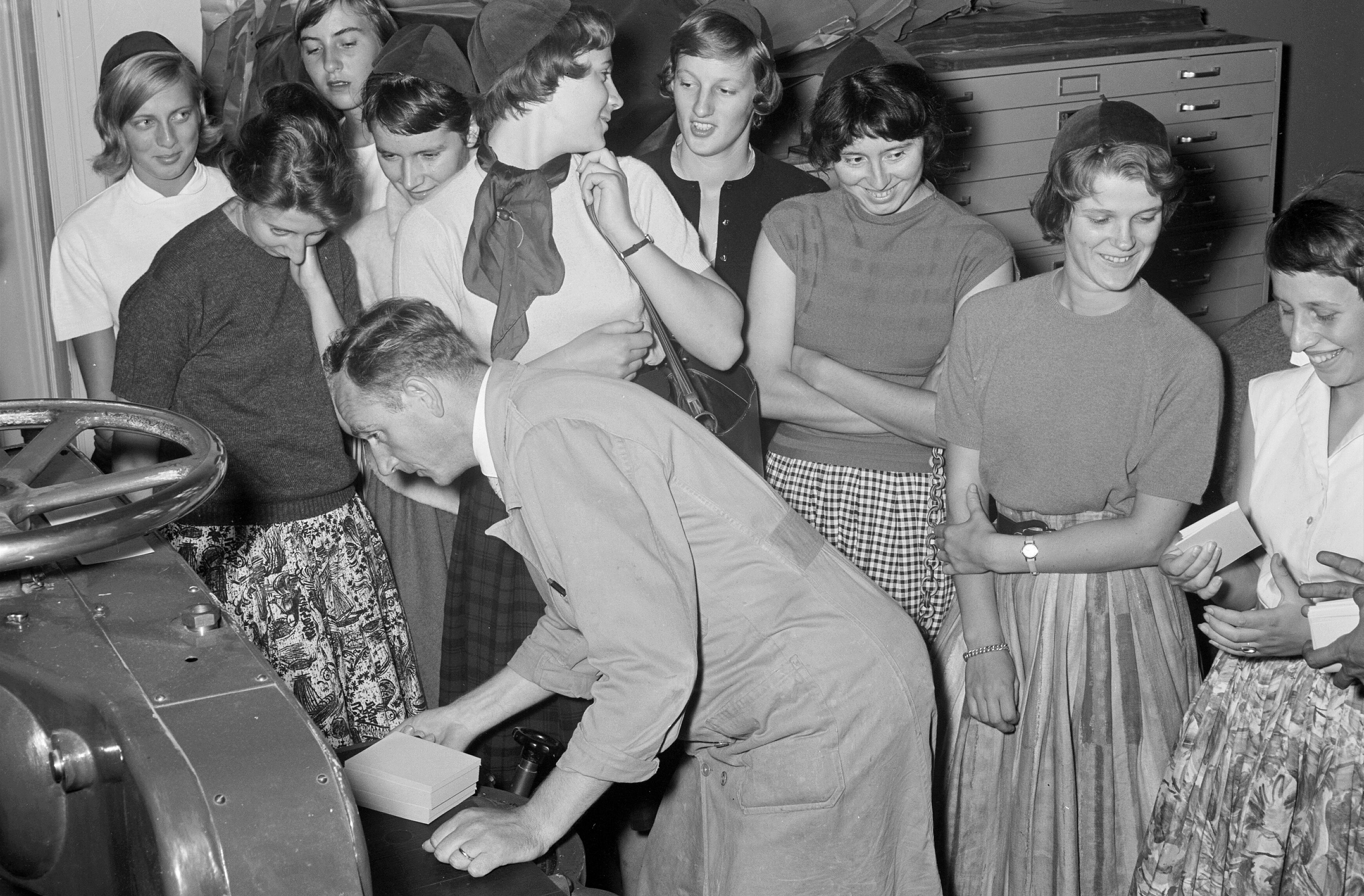 | Description | Vrouwelijke studenten bezoeken diverse afdelingen binnen de bibliotheek. Zij worden o.a. rond geleid langs de afdeling Aanvragen, CTC Centraal Technische Catalogus, de bibliografieen-, tijdschriften- en boekenleeszaal. Ook wordt de Fotografische Dienst en de Binderij bezocht. De rondleiding wordt afgesloten met koffie en gebak. |