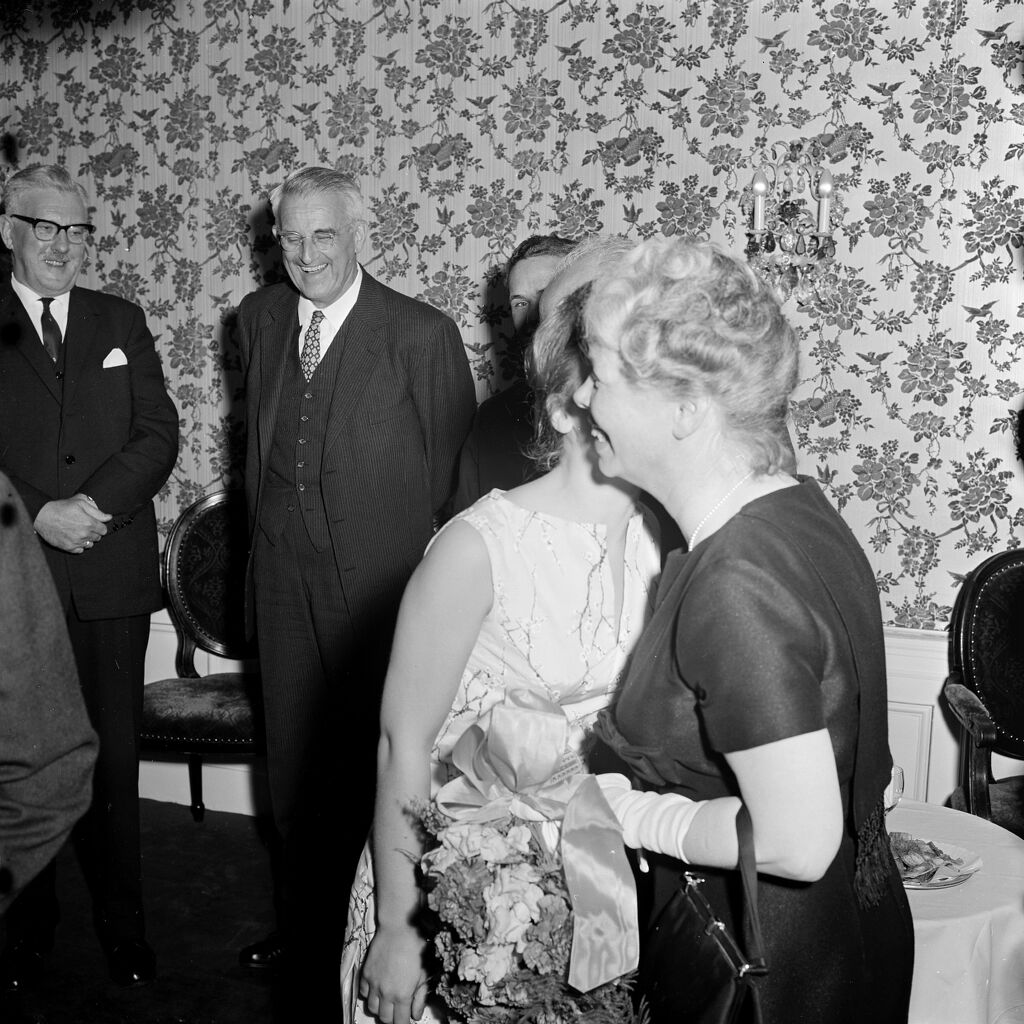 DescriptionDe Hoogewerff Gouden Medaille wordt iedere drie tot vijf jaar door het bestuur van de Stichting Hoogewerff-Fonds uitgereikt aan een gerenommeerde kandidaat die zich op uitzonderlijke wijze heeft onderscheiden op het gebied van de chemische technologie. De Stichting Hoogewerff-Fonds werd op 29 augustus 1917 gesticht door Professor dr. Sebastiaan Hoogewerff, oud-hoogleraar aan de toenmalige Technische Hoogeschool te Delft. De verantwoordelijkheid voor de selectie van kandidaten voor de Gouden Medaille berust bij het Bestuur van het Hoogewerff-Fonds, bestaande uit personen afkomstig uit het bedrijfsleven en het chemisch-technologisch wetenschappelijk onderwijs en onderzoek, die gezamenlijk geacht worden alle voor deze onderscheiding in aanmerking komende personen in Nederland te kennen. De onderscheiding wordt beschouwd als een belangrijke waardering voor het gehele levenswerk van de kandidaat. Prof. dr. M. Tausk ontving de medaille in 1963. Prof.dr. M. Tausk (1902 - 1990) trad in 1927 in dienst bij de Pharmaceutische Fabriek Organon te Oss en heeft zich bijzonder verdienstelijk gemaakt op het gebied van de fabricage van geneesmiddelen. Hij werkte mede aan de synthese van cortison en de volledige chemische synthese van steroïden, de hormoon- en orgaanpreparaten. Op de foto's de receptie en het diner ter ere van de uitreiking van de medaille.