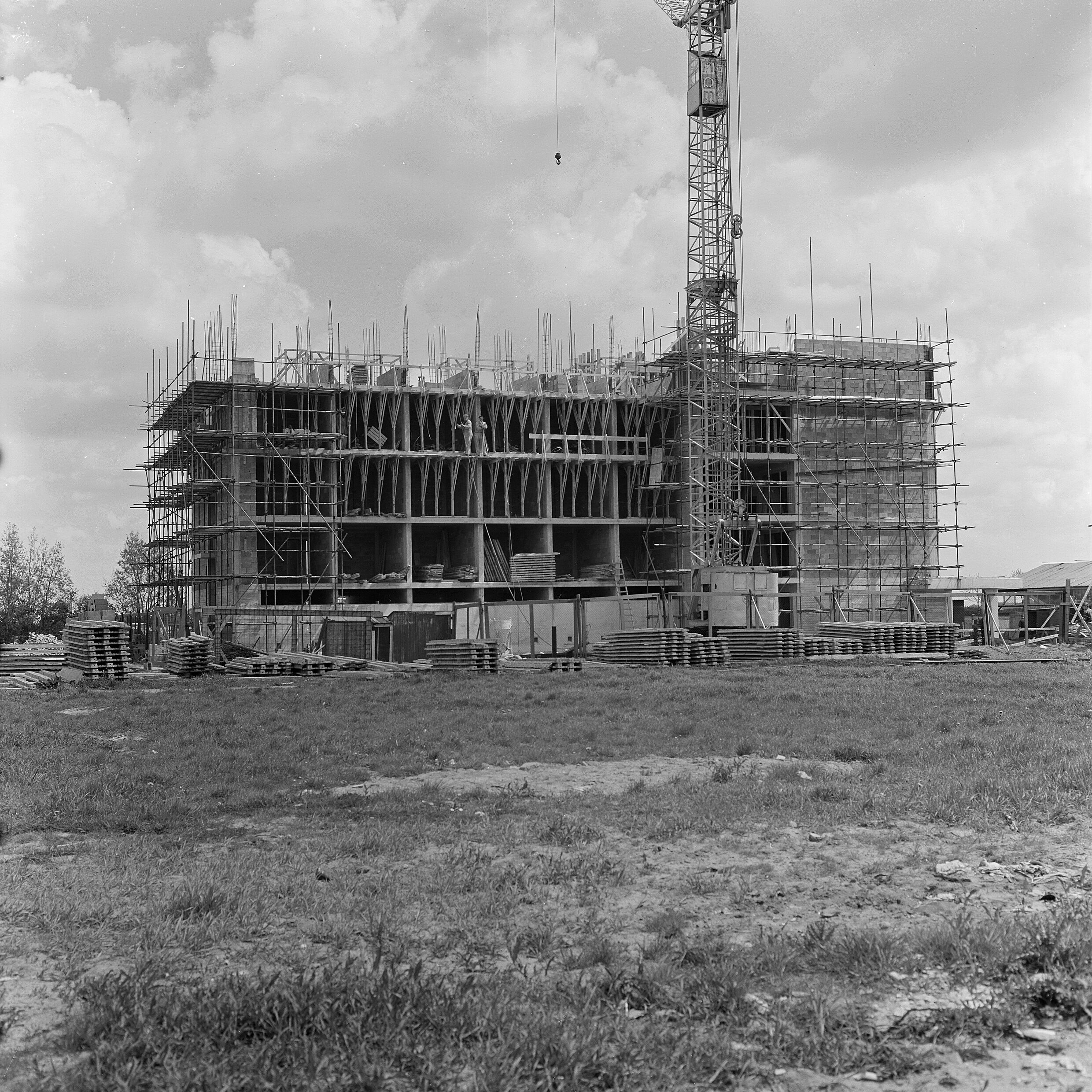 | Description | Een in aanbouw zijnde studentenflat aan de Prof. Evertslaan in Delft. De 1e paal wordt op 9 juni 1961 geslagen. De flat telt 8 verdiepingen en er kunnen ongeveer 150 studenten gehuisvest worden. De flat is een ontwerp van de Haagse architect K.J. Roosendaal en wordt gebouwd door de Nederlandse Bouw Maatschappij Zaandam N.V. uit Den Haag. Bron: TH Mededelingen |