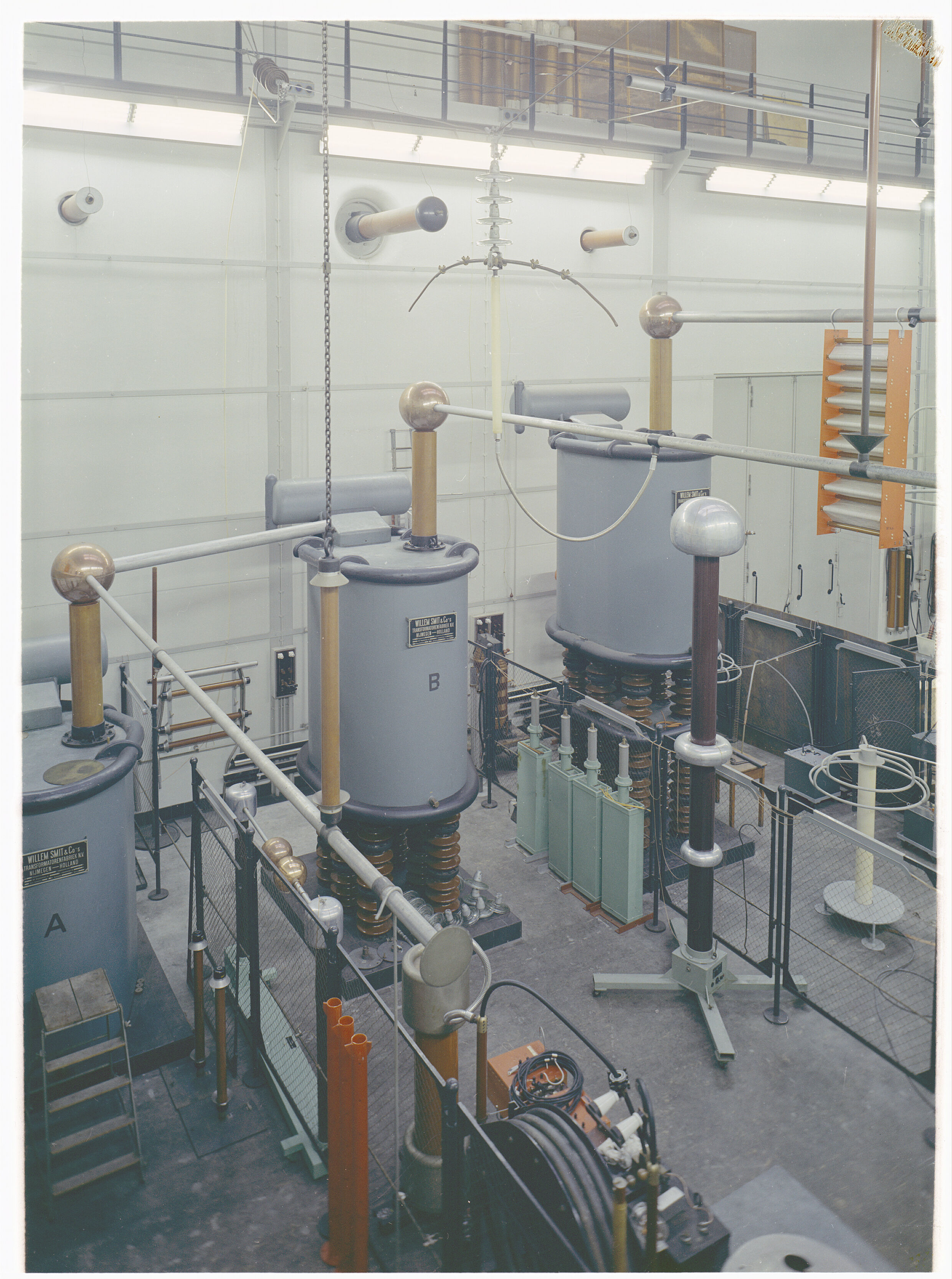 | Description | Opstelling in het Laboratorium voor hoogspanningstechnieken bij afdeling der Elektrotechniek waarbij op 2 foto's een vonkenbrug zichbaar is. |