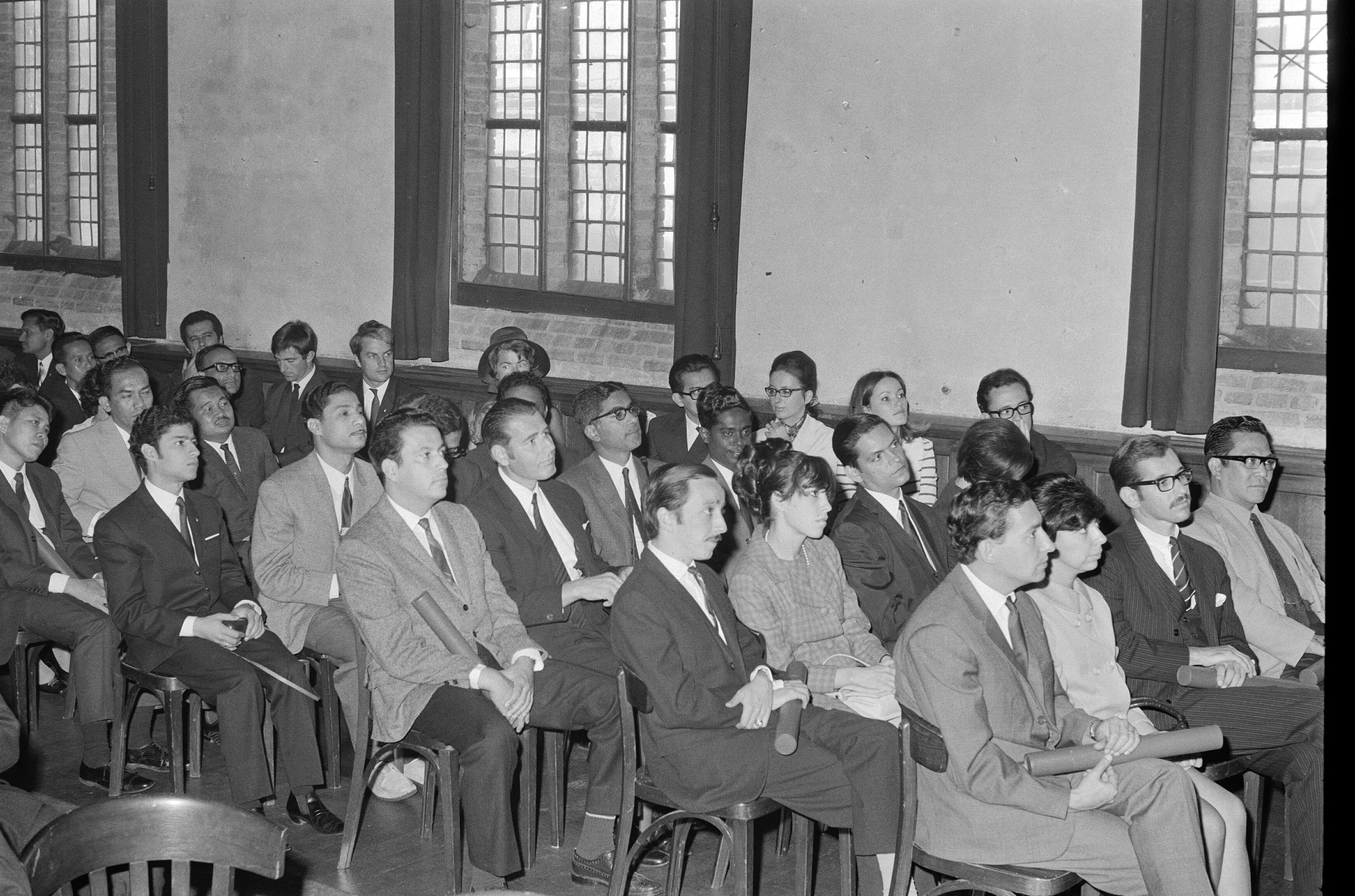 | Description | Diploma-uitreiking van de internationale cursus Waterbouwkunde door prof. dr. L.J. Mostertman in de St. Hippolytuskapel aan de Oude Delft 118. De Technische Hogeschool Delft gebruikte de voormalige kapel van de Heilige Geestzusters tussen 1923 en 1966 als Aula. |