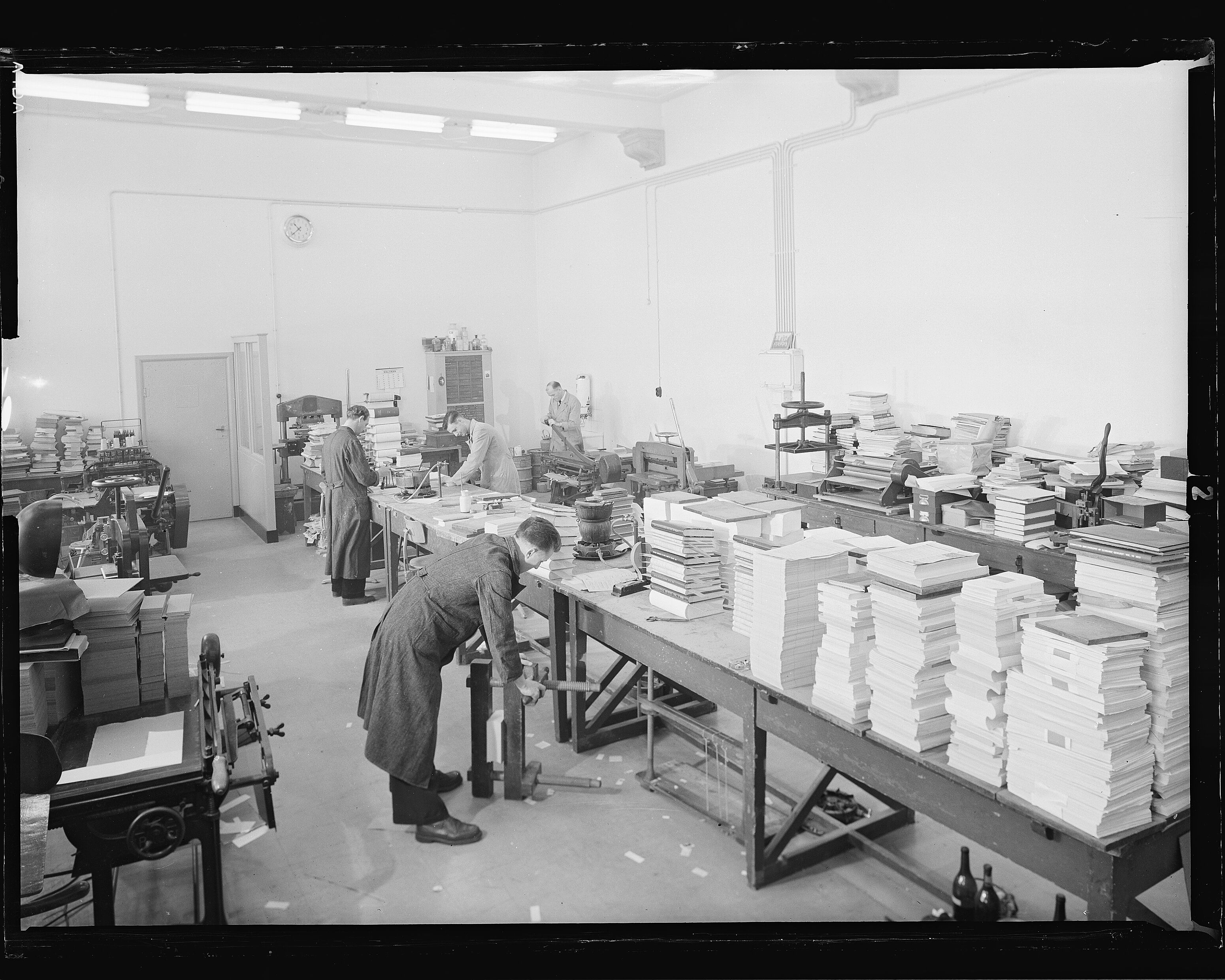 | Description | Na een half jaar op de Tentoonstellingszaal gehuisvest te zijn geweest, betrok de Boekbinderij in het najaar van 1954 weer haar eigen lokaliteit, die nu van een nieuwe, uit Colorith-tegels bestaande vloer voorzien was. Bij het opnieuw inrichten van de zaal werden de machines en apparaten meer efficiënt opgesteld. In de wintermaanden kregen wanden en deuren een nieuw verfje, zodat het geheel nu een prettige werkruimte is geworden. In juli 1955 werd een nieuwe verguldpers aangeschaft. Jaar 1955 is geschat. |