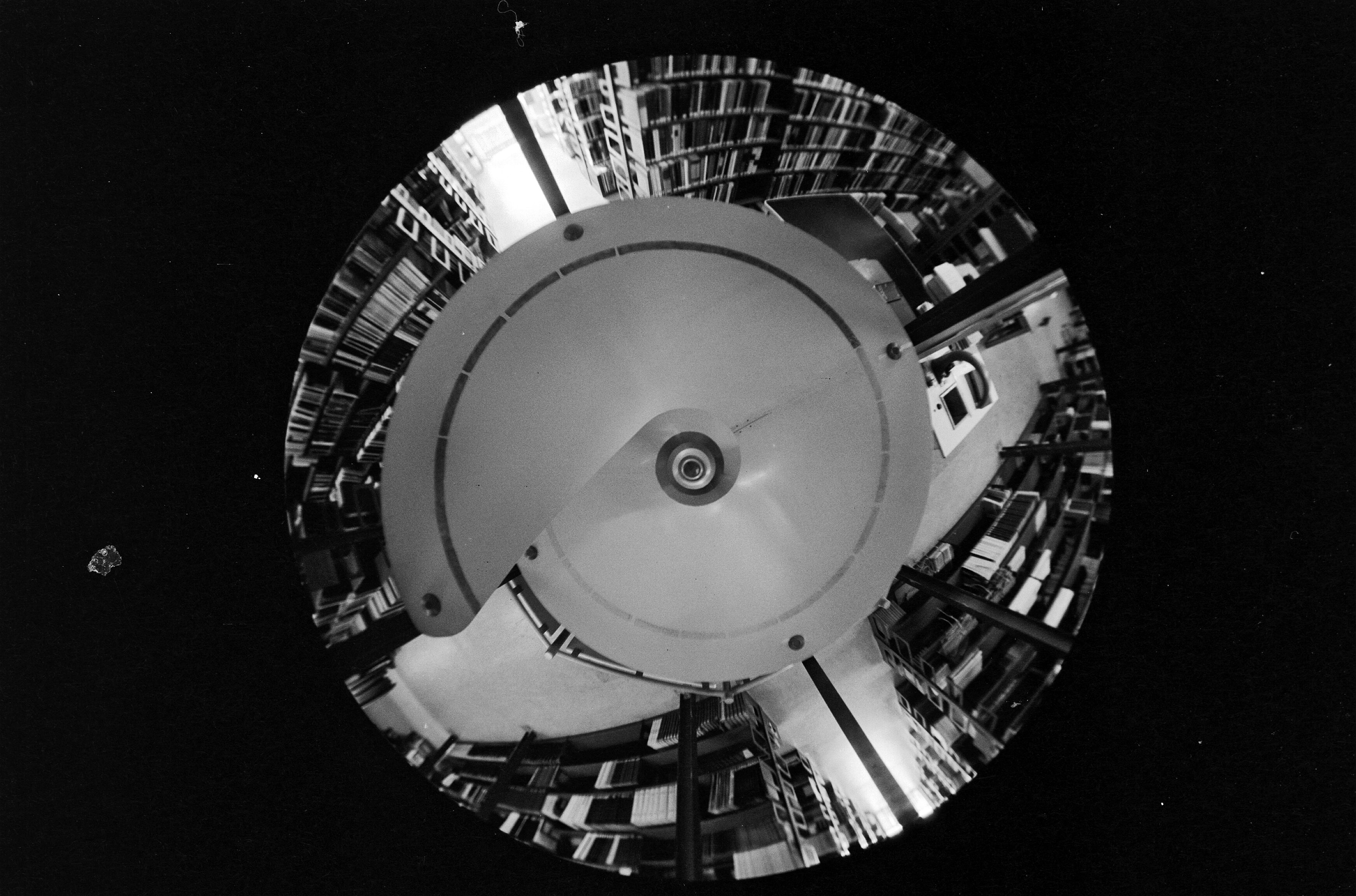 Fisheye objectief opnamen van de wentelgoot in de bibliotheek van de Technische Hogeschool Delft