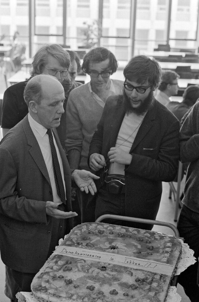 DescriptionStudenten van Democraten '69 bieden in de aula een taart aan de senaat van de Technische Hogeschool Delft aan.