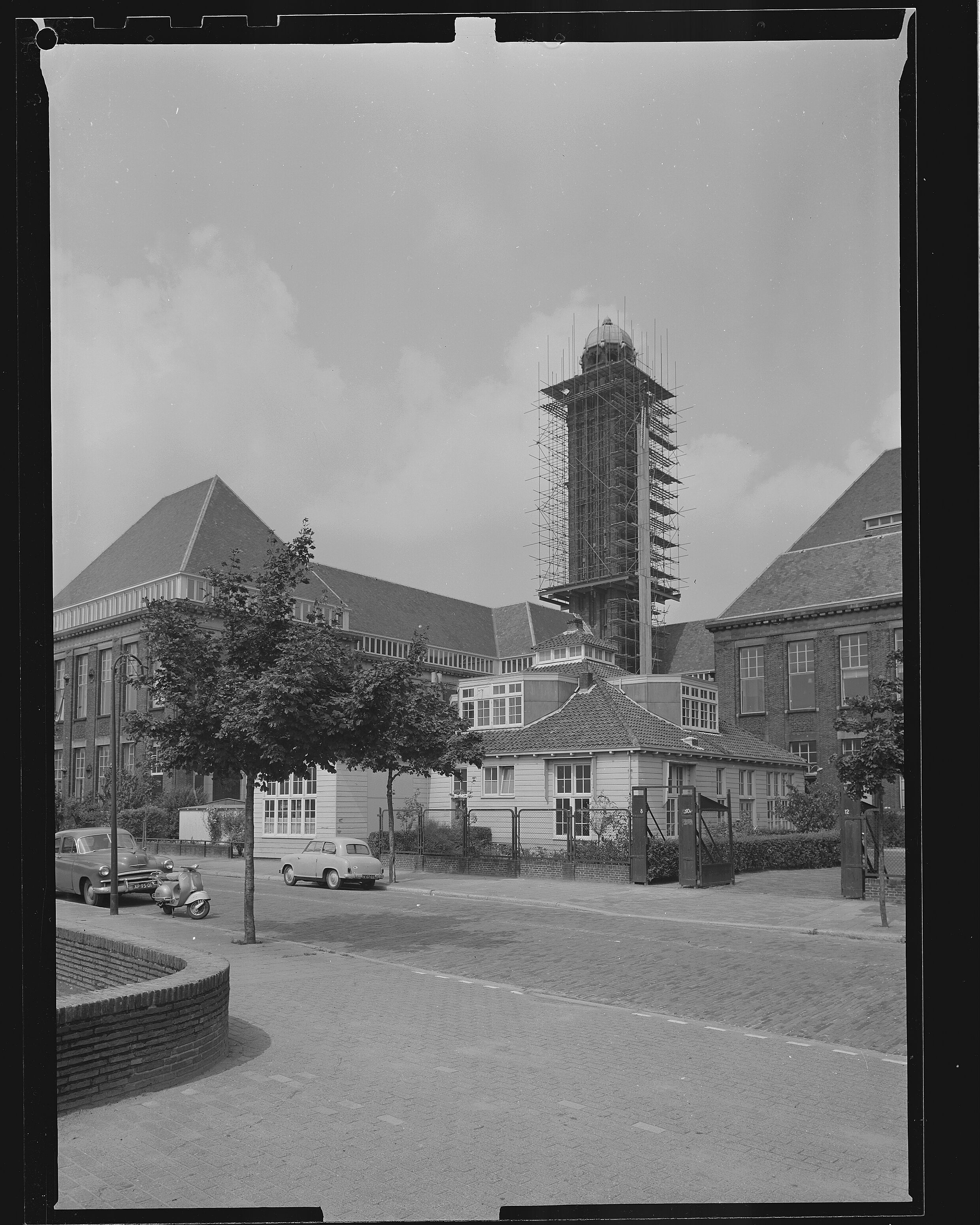 | Description | De toren van het Hoofdgebouw in de steigers. De foto's zijn genomen vanaf het huidige Zuidplantsoen. Jaar 1961 is geschat. |