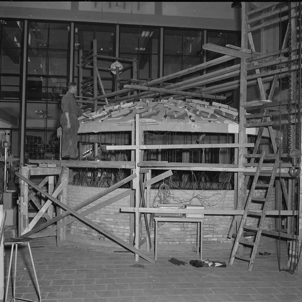 | Description | De bouw van een bolschaal in het Stevin-laboratorium. Het doel van de bolschaal is het kunnen meten van spanningen nabij de randen. Spanningen die daar optreden kunnen aan de hand van buigingstheorieën worden berekend. Aan het gedrag van de rand en van het randgebied kan vaak bepaald worden wanneer er een breuk plaats zal vinden. De middellijn van het model van de bolschaal is 5.40 m; de dikte is 3 cm. De openingshoek is 30 graden; de kromtestraal 5.40 m. Jaar 1958 is geschat. |