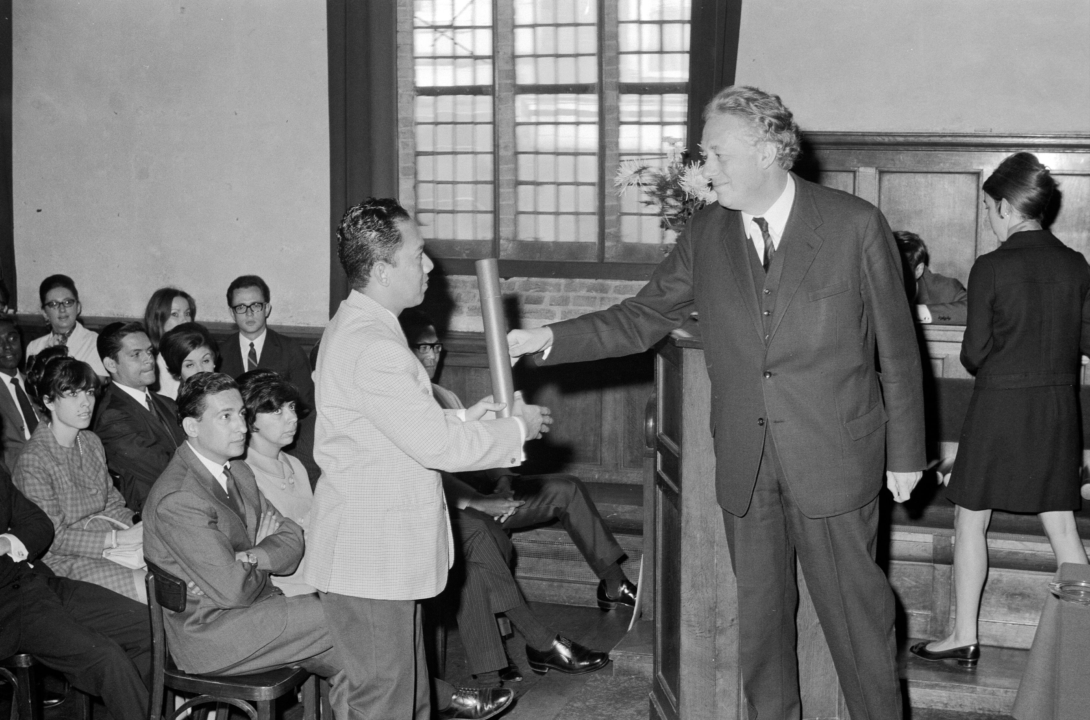 DescriptionDiploma-uitreiking van de internationale cursus Waterbouwkunde door prof. dr. L.J. Mostertman in de St. Hippolytuskapel aan de Oude Delft 118. De Technische Hogeschool Delft gebruikte de voormalige kapel van de Heilige Geestzusters tussen 1923 en 1966 als Aula.