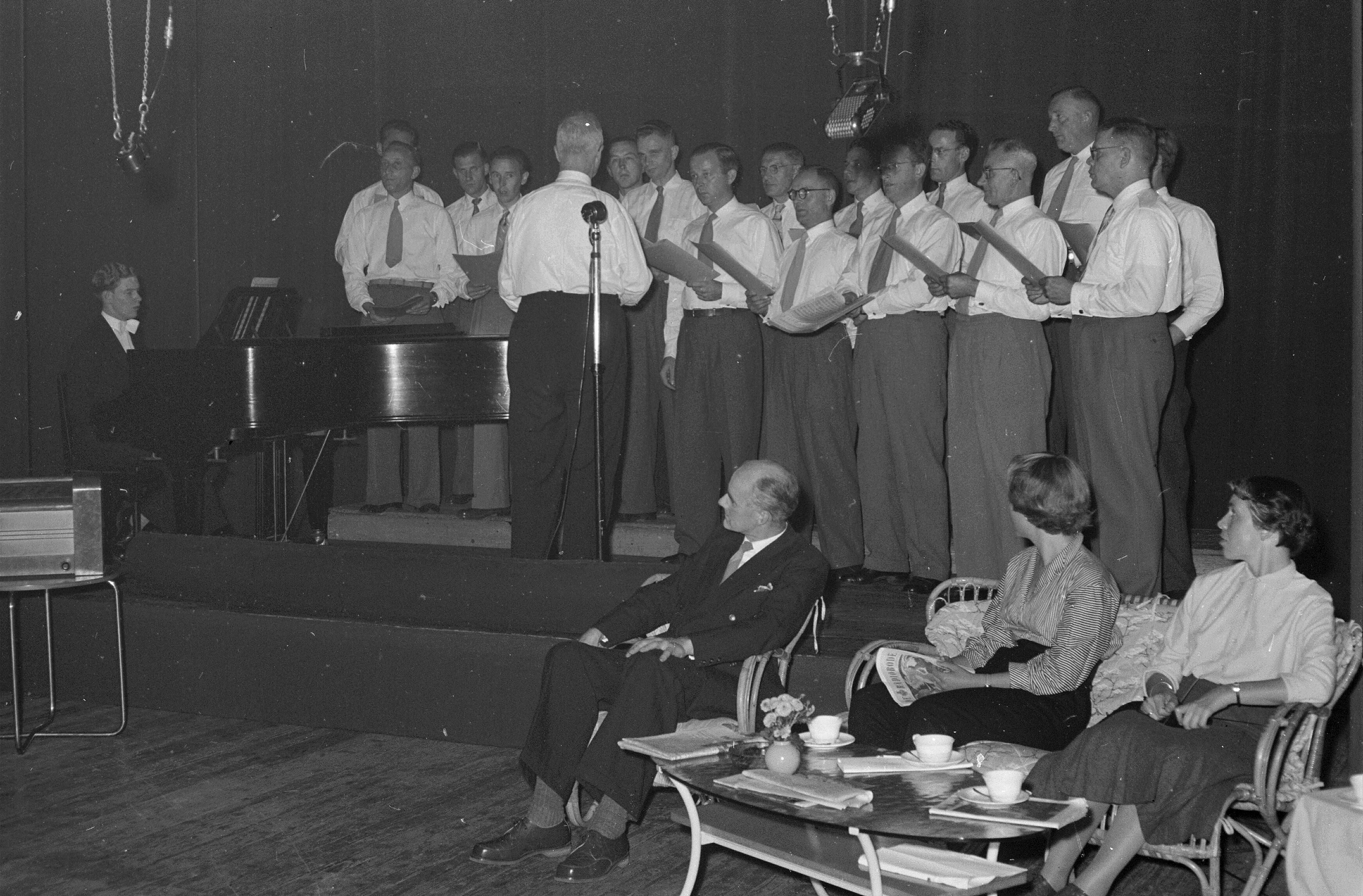 | Description | Feestavond ter gelegenheid van het 50-jarig bestaan van de TH Delft en ter afsluiting van de tentoonstelling "Machiek" in het zalencomplex van de Haagse Dierentuin. De voorzitter van de herdenkingcommissie bood de eerste zes exemplaren van het TH-gedenkboek aan aan de makers van het boek. Met muzikale omlijsting van Mannenzangkoor van de C.A.P.V. "Prometheus", Muziekvereniging "T.H.-Personeel" en het duo "Black and White". |