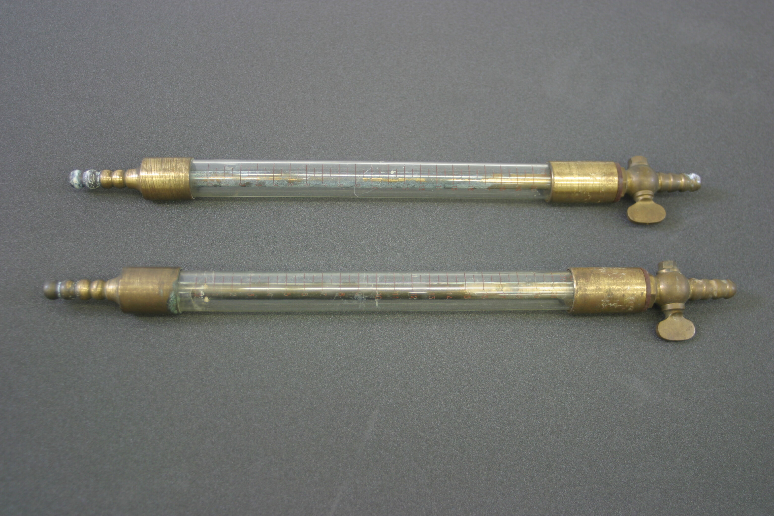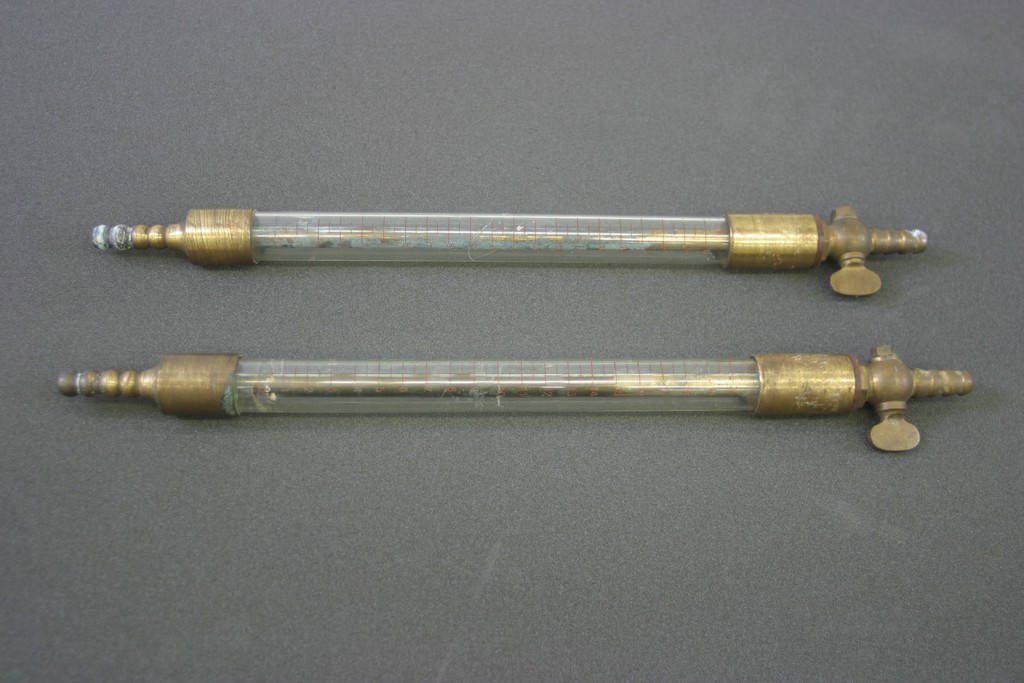 | Description | Flesjeswaterpas om in een onregelmatig terrein (bijvoorbeeld door een rivierbedding) een bekende hoogte over te brengen naar een ander punt. Het waterpas werkt volgens de wet van de communicerende vaten. Het flesjes waterpas bestaat uit twee 'flesjes', de slang die de verbinding vormde is niet aanwezig. De flesjes zijn waarschijnlijk in eigen beheer gemaakt. Ieder flesje is aan twee zijden voorzien van een messing kraan, de schaalverdeling loopt van 1 tot 20. |