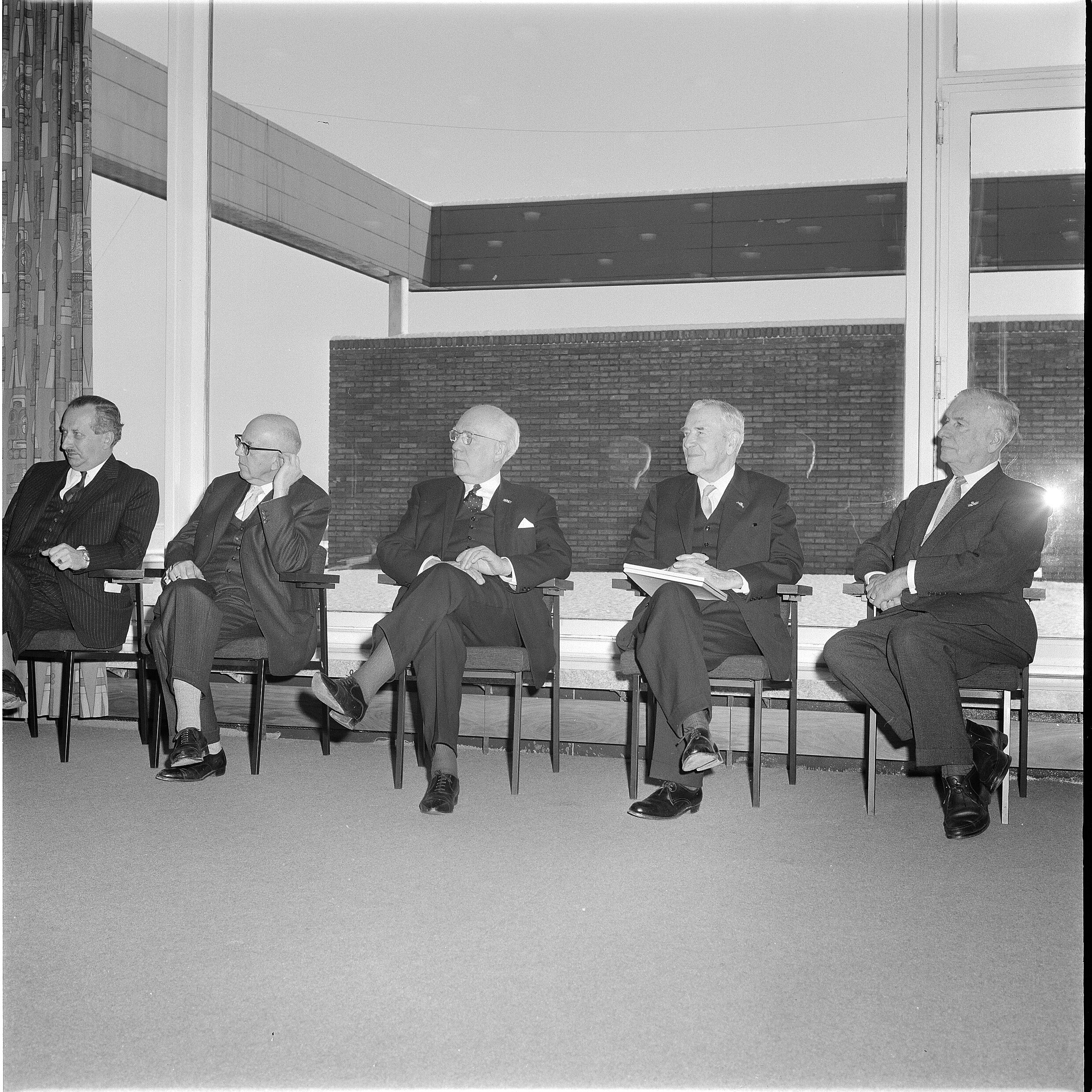 DescriptionHet vijfentwintigste lustrum Een hoogtepunt in 1967 vormt wel de viering van het vijfentwintigste lustrum van de hogeschool, waarvan hier in chronologische volgorde een beknopt verslag volgt van de belangrijkste evenementen te weten: De tentoonstelling, die onder de intrigerende naam van “Speur-ond” in het aulagebouw werd gehouden Het symposium over het onderwerp “Toepassingen van rekentechnieken” De buitengewone senaatsvergadering, waarbij vier eredoctoraten werden uitgereikt De feestavonden, die op 19 en 20 februari 1967 de lustrumviering besloten Geschenken n.a.v. het lustrum aangeboden tijdens de opening van het lustrum. Namens het personeel bood de voorzitter van personeelsvereniging Prometheus een bedrag onder enveloppe aan, bedoeld voor de aankoop van een vleugel voor de Aula. Een schilderij, waarin de oude aula en het nieuwe aulagebouw als het ware “geintegreerd” zijn, werd aangeboden door de heer H.J. Vos, voorzitter van de Vereniging voor Studie- en Studentenbelangen. Na hem kwamen de leden van de presidentenraad – collectie maar met behoud van ieders zelfstandigheid – hun wensen aanbieden. Het gezamenlijk geschenk, waardig gedragen door de presidente van de DVSV, bestond uit een verzameling keilbouten, bestemd om “Blikken Dinges” op een vaste plaats, overeenkomstig de waarde die de rector er aan toe kent, voor eeuwig te verankeren. Aansluitend op deze besloten bijeenkomst opende de voorzitter van de Raad voor Wetenschapsbeleid, prof. Dr. C.J.F. Böttcher, de tentoonstelling “Speur-ond” op originele wijze door middel van een breukproef op een ondergekoelde stalen balk. Bron. Technische Hogeschool Delft Jaarboek 1967