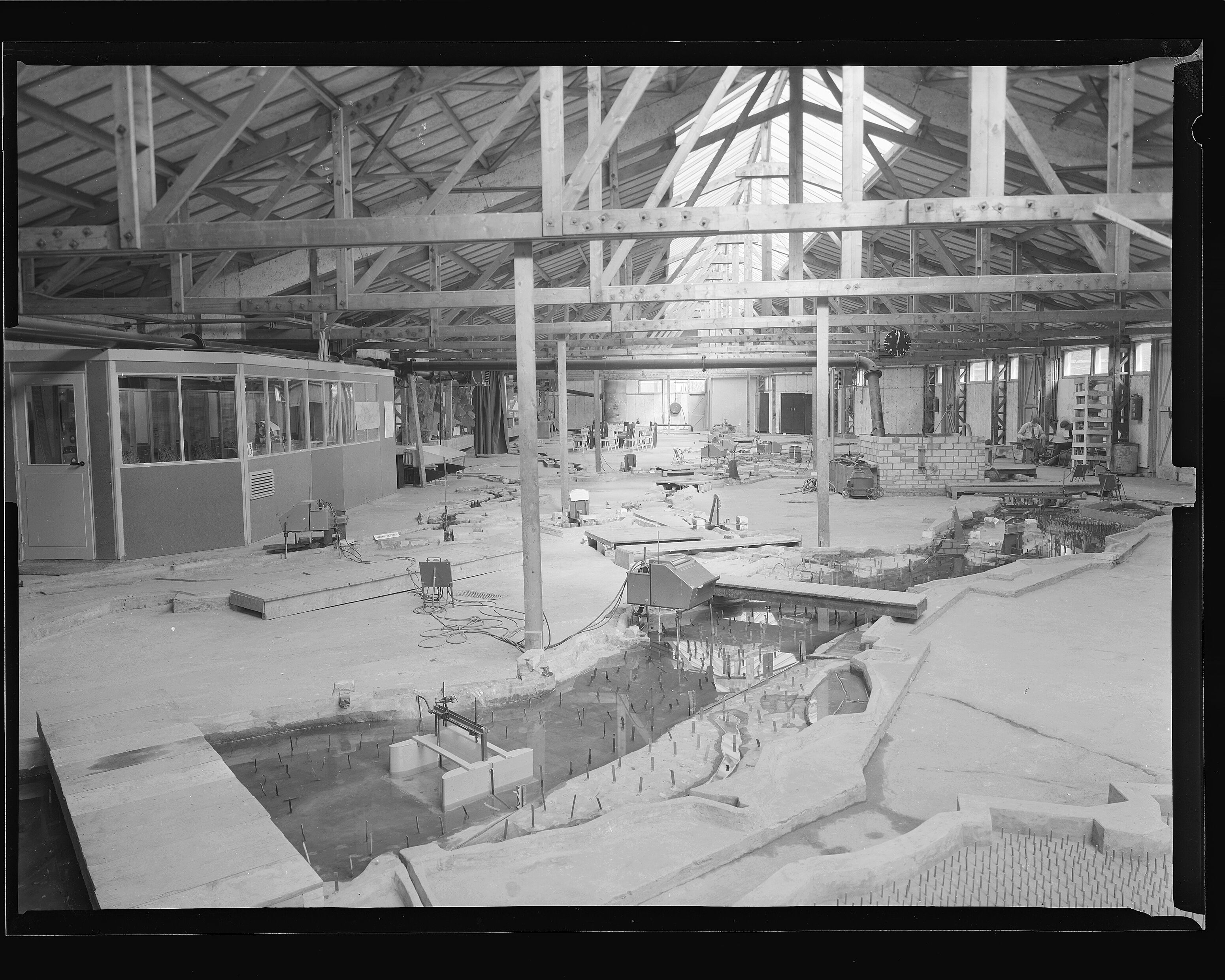 | Description | Modellen ten behoeve van onderzoek in het Waterloopkundig Laboratorium aan de Raam. Een model gebouwd in een houten loods; de bouw van een model achter het gebouw en een model gebouwd in de grote hal. Jaar 1960 is geschat. |