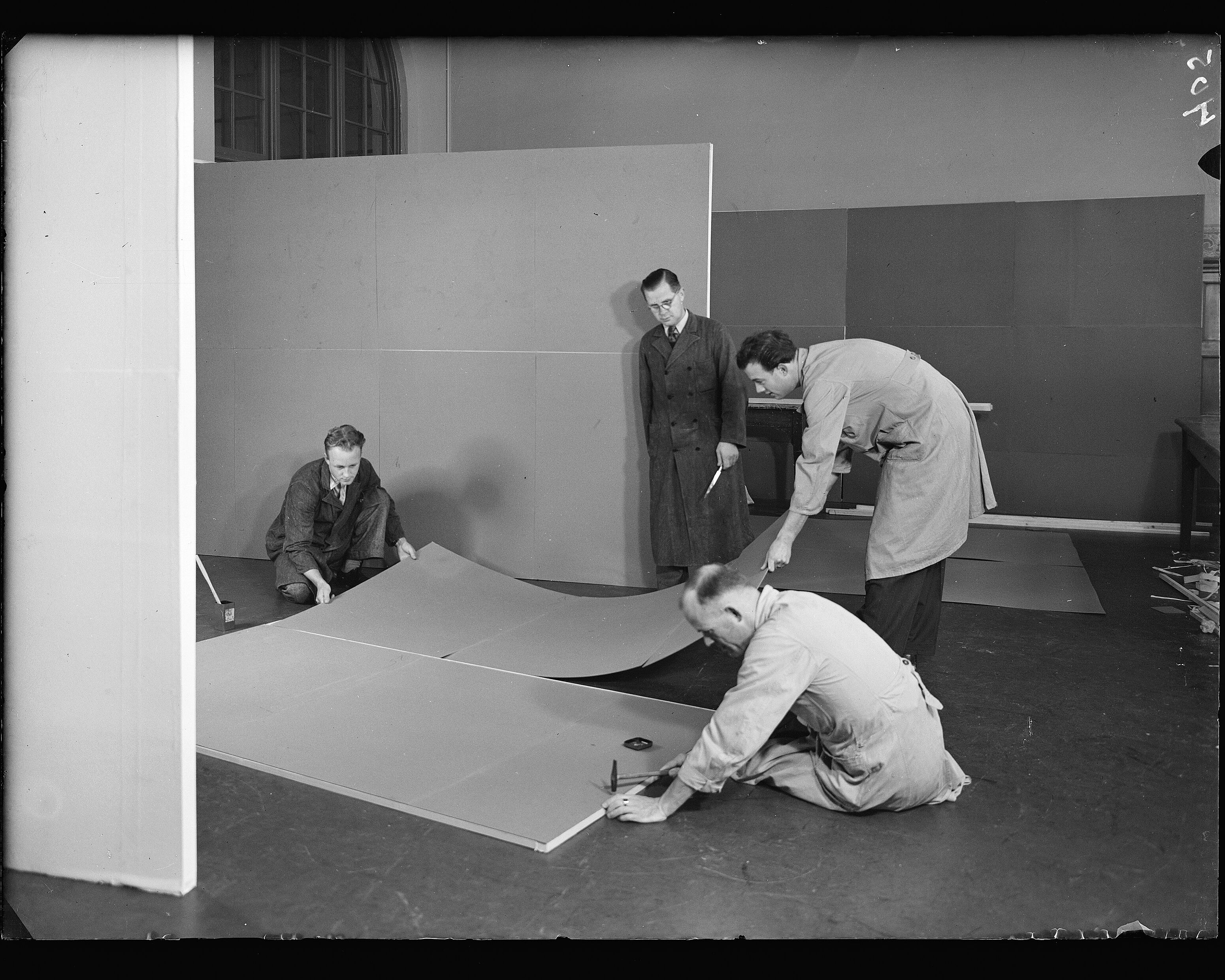 | Description | Opbouwen en inrichten van een tentoonstelling over J.H. van 't Hof, grondlegger Fysische chemie, op galerij boven de hal in de Bibliotheek van de Technische Hogeschool Delft. Mannen met stropdas en stofjas monteren de tijdelijke wandjes. Jaar 1955 is geschat. |