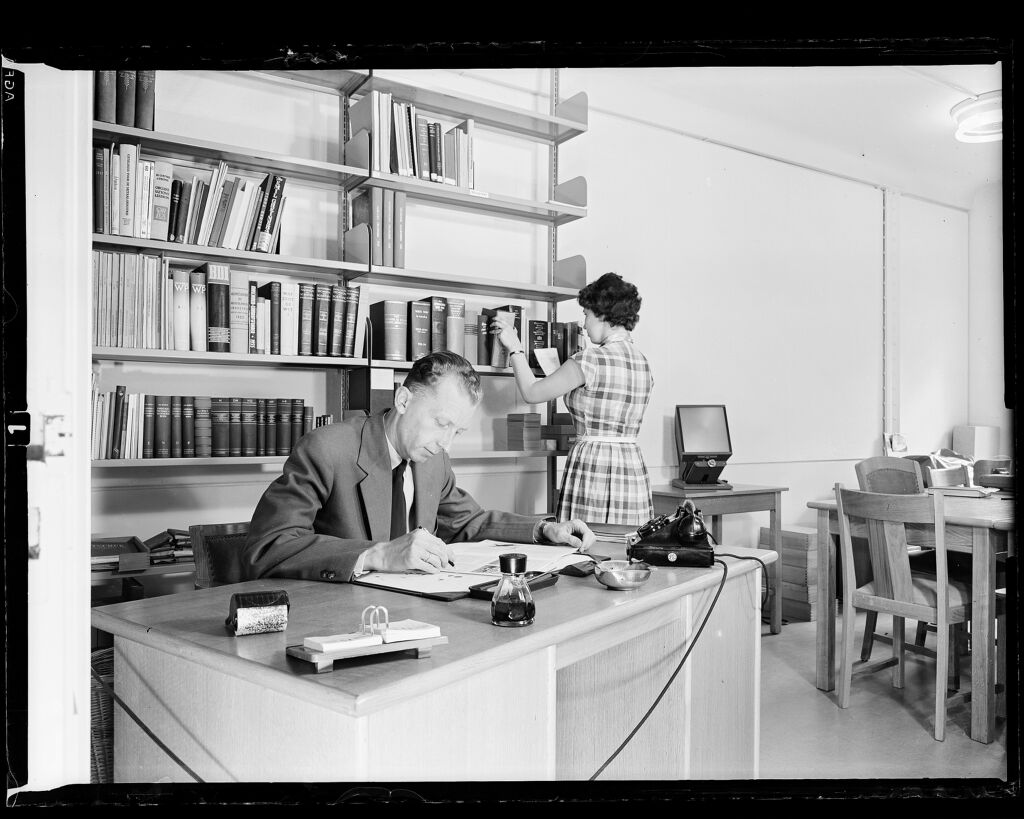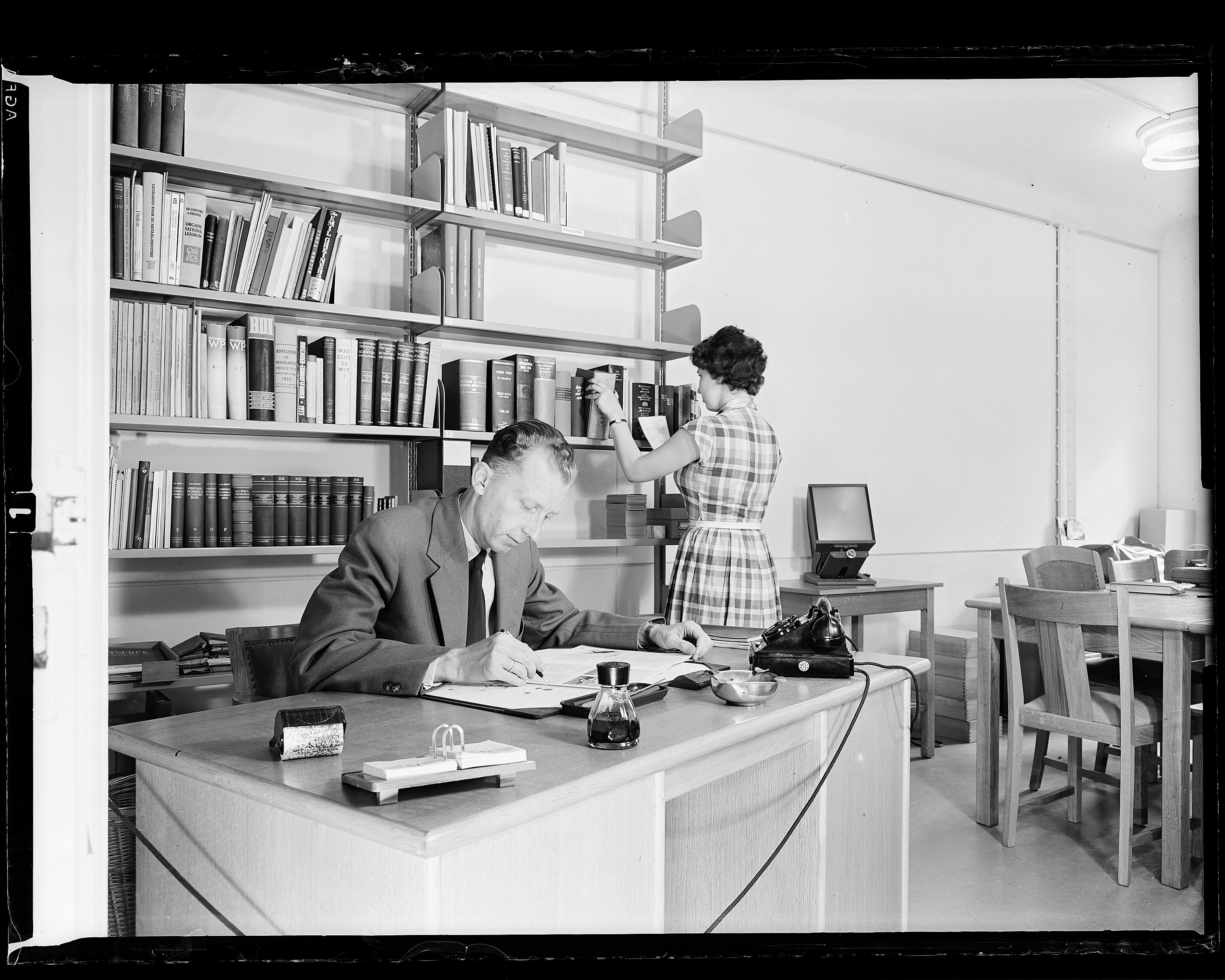 DescriptionBibliotheekpersoneel bezig met telefoneren, verwerken van kaarten voor de onderwerpscatalogus en administratie. Op de foto's is nog een microfiche reader te zien. Jaar 1956 is geschat.