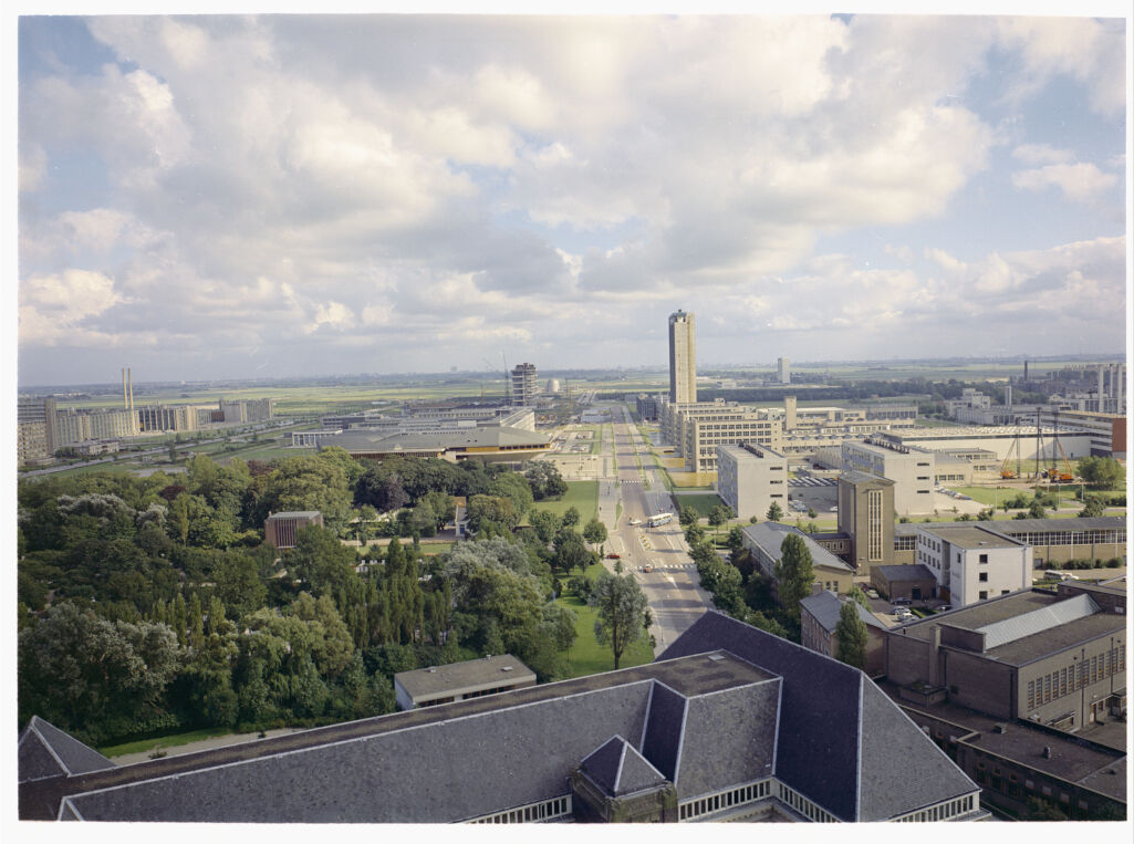 | Beschrijving | De Mekelweg en omgeving gezien vanaf het dak van het hoofdgebouw van de Technische Hogeschool aan de Julianalaan te Delft. Op de foto's zijn o.a. te zien de gebouwen van Werktuigbouwkunde en Scheepsbouwkunde, Technische Natuurkunde, Elektrotechniek, Scheikunde, Lucht- en Ruimtevaarttechniek, Wiskunde en Informatica, Civiele Techniek (in aanbouw), Bouwkunde (in aanbouw), de aula, de kernreactor, gebouwen van TNO en het Kramers laboratorium. |
