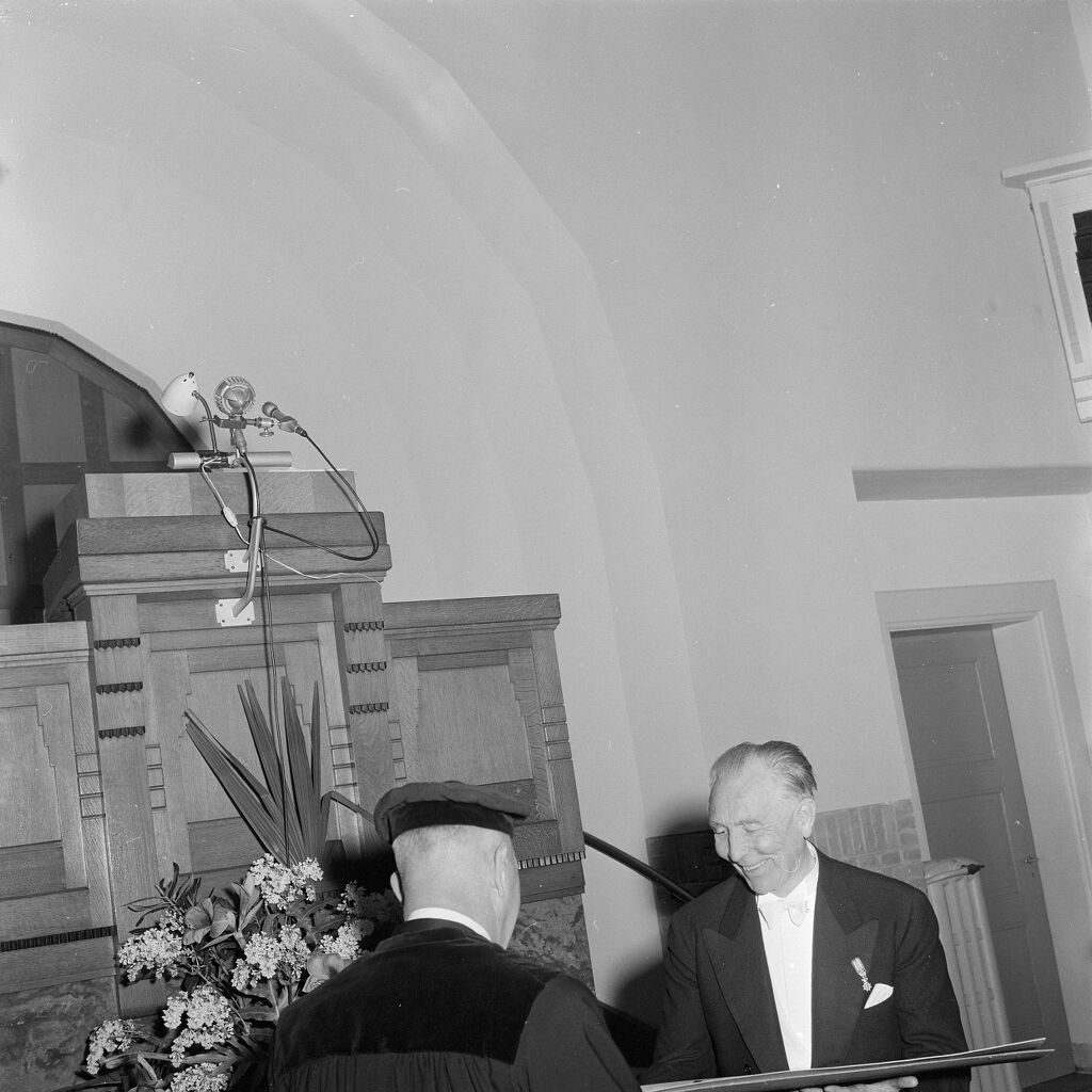 | Beschrijving | De viering van 121e Dies Natalis van de TH Delft in de Westerkerk te Delft met aansluitend een receptie in het Prinsenhof op 12 januari 1963. De viering stond in het teken van de erepromotie van dr. A. Bouwers. |