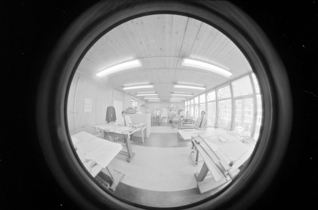 | Beschrijving | Fisheye objectief opnamen van de tekenkamer van het Waterloopkundig Laboratorium aan het Raam in Delft. Door de ramen is de bibliotheek van de TH Delft zichtbaar. |