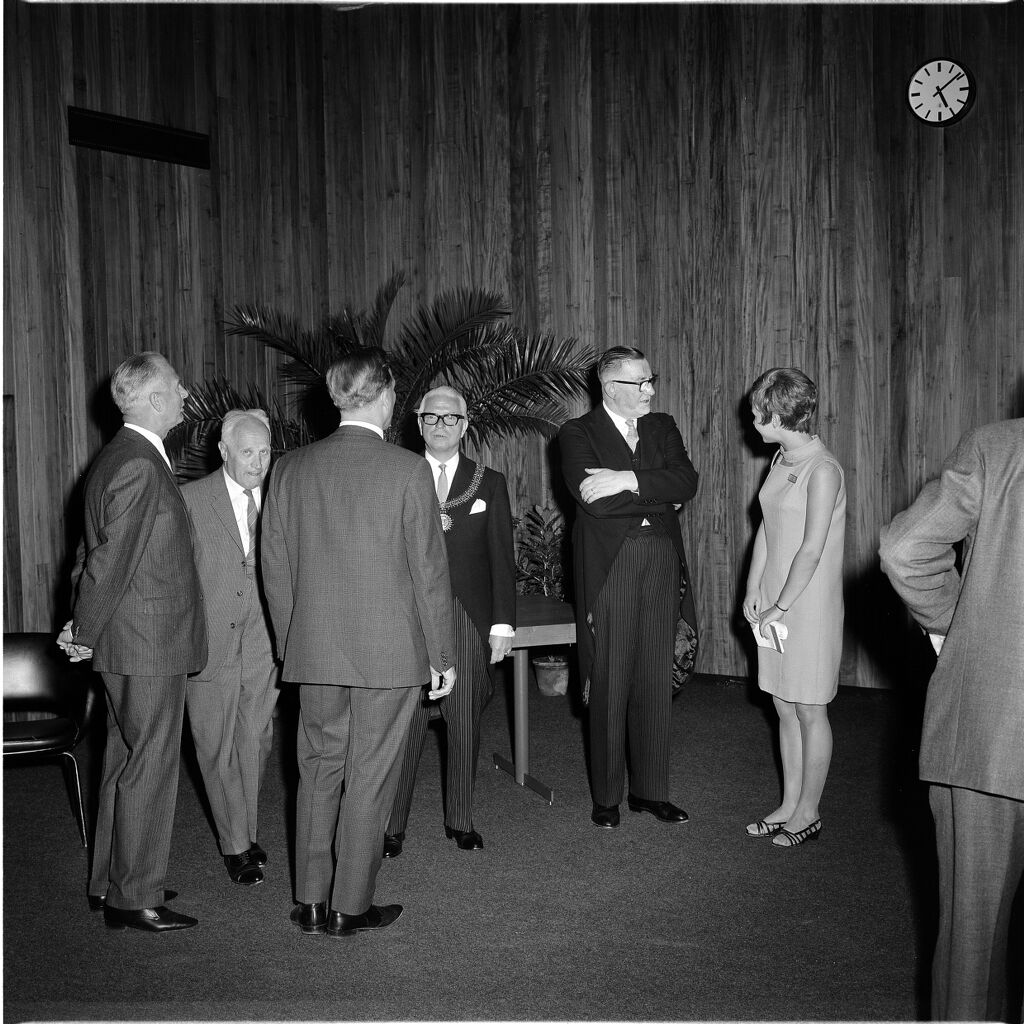 | Beschrijving | Opnamen burgemeester J.M. Ravesloot O. en W. voetbal- en volleybaltoernooi 1967 Dit inmiddels tot traditie geworden jaarlijkse sporttoernooi is voor de tweede maal op Delftse bodem gehouden, namelijk op de terreinen van de Studenten Sportstichting aan de Berlageweg. Er moge aan worden herinnerd dat sedert 1952 de voetbalelftallen en later de volleybalteams - samengesteld uit het personeel van de universiteiten en hogescholen elkaar jaarlijks om de door de minister van onderwijs en wetenschappen beschikbaar gestelde wisselbeker plegen te bekampen. In 1952 vond dit sportgebeuren voor het eerst in Delft plaats. Op donderdag 15 juni arriveerden reeds voor 9 uur de eerste deelnemende elftallen en teams met bussen aan de aula. Na binnenkomst van alle deelnemers en supporters verwelkomde de voorzitter van de organisatiecommissie , prof.dr.ir. W.J. Beek, het gezelschap in het groot-auditorium. Na deze begroeting begaf men zich naar de terreinen van de Studenten Sportstichting, waar de deelnemende sportbeoefenaren een uitstekend voorbereide organisatie aantroffen, die tot het eind van de dag feilloos heeft gewerkt. Om klokslag 10 uur begon het toernooi van de voetbalelftallen en de volleybalteams. Behalve de uitstekende sportieve sfeer, die geen moment verflauwde, hebben ook de weersomstandigheden zich voor het beoefenen van sport bijzonder goed gehouden. Om kwart over vier kwam de minister van onderwijs- en wetenschappen, dr. G.H. Veringa, vergezeld door curatoren en enige Senaatsleden, op het sportterrein aan. De minister verrichtte hier de aftrap voor de voetbalfinale tussen de elftallen van de TH Delft en de RK Universiteit Nijmegen . Om 5 uur was het Sporttoernooi 1967 – voor zover het de actieve beoefening betrof-historie geworden. Het gemeentebestuur van Delft bood de ongeveer 600 deelnemers vervolgens in de aula een receptie aan. De sportbeoefenaren hadden daarbij rijkelijk de gelegenheid de op het veld wel en niet benutte kansen nog eens uitvoerig te bespreken. Delft dubbel winnaar Stipt volgens het tijdschema , precies half zeven, vond in het groot-auditorium de prijsuitreiking plaats. De minister zei het zich tot een eer te rekenen de eerste prijzen te mogen uitreiken te midden van 600 van de 23 000 ambtenaren die het hoger onderwijs verzorgen . De minister gewaagde nog van de steeds nauwere samenwerking tussen de universiteiten en hogescholen, waarvan deze dag als een speerpunt mocht worden gezien. Zijn Excellentie reikte daarop de eerste prijs uit aan het voetbalelftal van de Technische Hogeschool Delft en aan het volleybalteam, eveneens van de TH Delft . Beide prijzen bestonden uit de door de minister beschikbaar gestelde wisselbeker. De voorzitter van curatoren, ir. L. Schepers, reikte vervolgens de door curatoren beschikbaar gestelde 2e prijs uit, een beker, aan het voetbalelftal van de RK Universiteit Nijmegen. De rector magnificus, prof. H.J. de Wijs, verrichtte deze taak voor de door de senaat beschikbaar gestelde 2e prijs , eveneens een beker. Deze ging naar het volleybalteam van de Rijksuniversiteit Groningen. De burgemeester van Delft , mr. J.M. Ravesloot, prees - alvorens tot uitreiking van de 3e prijs over te gaan - de goede samenwerking tussen de TH en de gemeente. Hij overhandigde daarop de prijs van de gemeente Delft , een Delftsblauw bord, aan het voetbalelftal van Rijksuniversiteit Groningen en het volleybalteam van de Rijksuniversiteit Nijmegen. De troostprijs ten slotte, welke de personeelsvereniging "Prometheus" beschikbaar stelde, werd bij monde van de heer J.H. Haakman aangeboden aan het voetbalelftal van de VU te Amsterdam en het volleybalteam van de LHS te Wageningen. De finale van dit bijzonder goed geslaagde en sportief verlopen toernooi bestond uit het diner, dat de ongeveer 600 deelnemers in de kantine van de aula werd geserveerd met muzikale omlijsting. In 1968 is het Ministerie van onderwijs en wetenschappen aan de beurt als organisator en gastheer van het O. en W.-toernooi op te treden. Bron: TH Mededelingen 14(10)1967 |