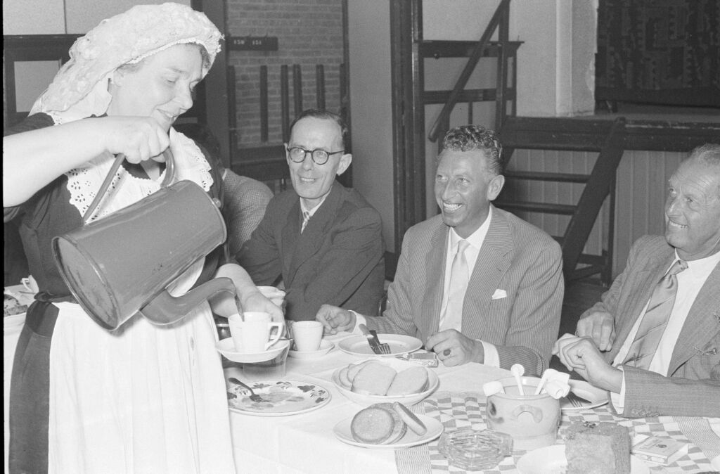 | Beschrijving | Dagje uit voor personeelsleden van het hoofdgebouw van de TH Delft. Hier aan de koffie tijdens hun excursie naar de textielfabriek Gebroeders Diepen. |