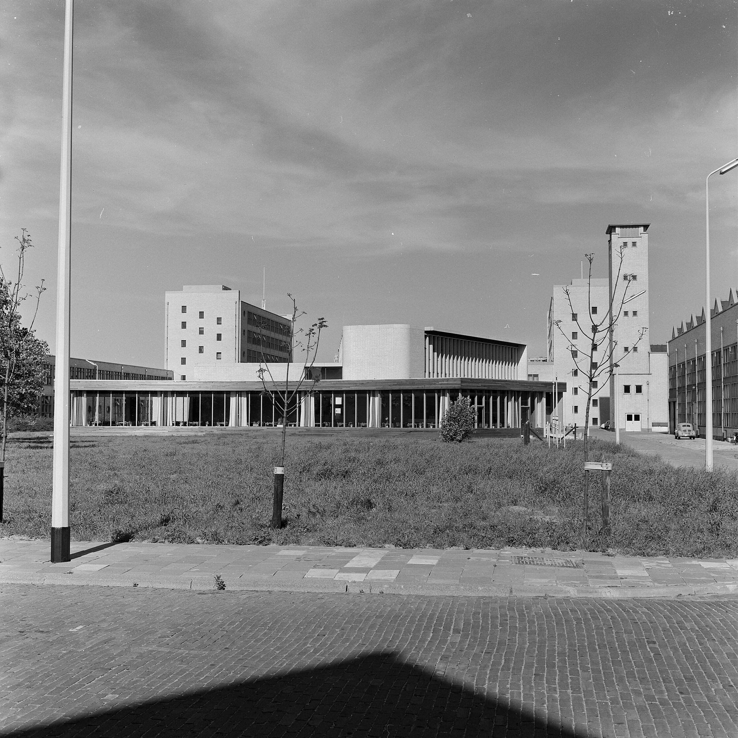 | Beschrijving | Buitenaanzicht van de nieuwe kantine van het gebouw voor Werktuigbouwkunde en Scheepsbouwkunde aan de Mekelweg 2. De kantine is gebouwd aan het eind van de gang met collegezalen. De kantine is op 1 juni 1961 in gebruik genomen. |