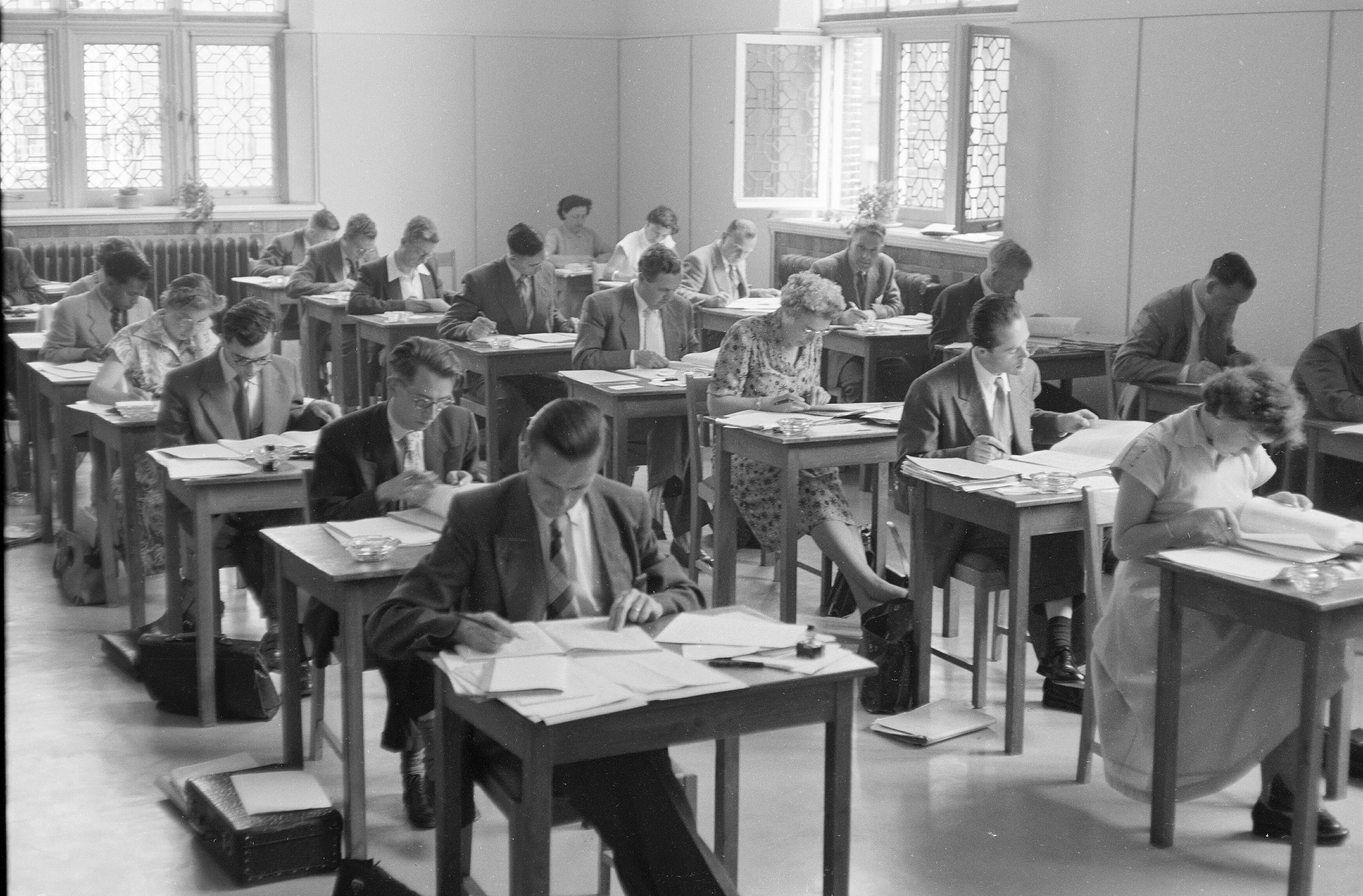 DescriptionDeelnemers van de cursus Gemeenschappelijke Opleidingen (GO) 1954-1955 leggen examen af in de Bibliotheek van de TH Delft.