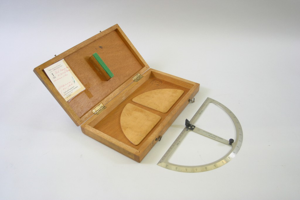 BeschrijvingTachymeter-transporteur of poolcoördinatograaf (Rapporteur), door Otto Fennel & Söhne, voor tekenen van metingen volgens de voerstraalmethode. Een hulpmiddel bij het bepalen van gemeten richtingen bij het tekenen. Bereik van 0 tot 200 graden en 200 tot 400 graden (decimaal). Liniaal heeft een millimeterverdeling. Gemaakt van nieuw-zilver (invar), in een houten kist met aantekening: Uitsluitend voor eigen gebruik. Otto Fennel, opgeleid door F. W. Breithaupt & Sohn, richtte in 1851 in Kassel zijn eigen onderneming op die ongeveer 100 jaar lang heeft bestaan.