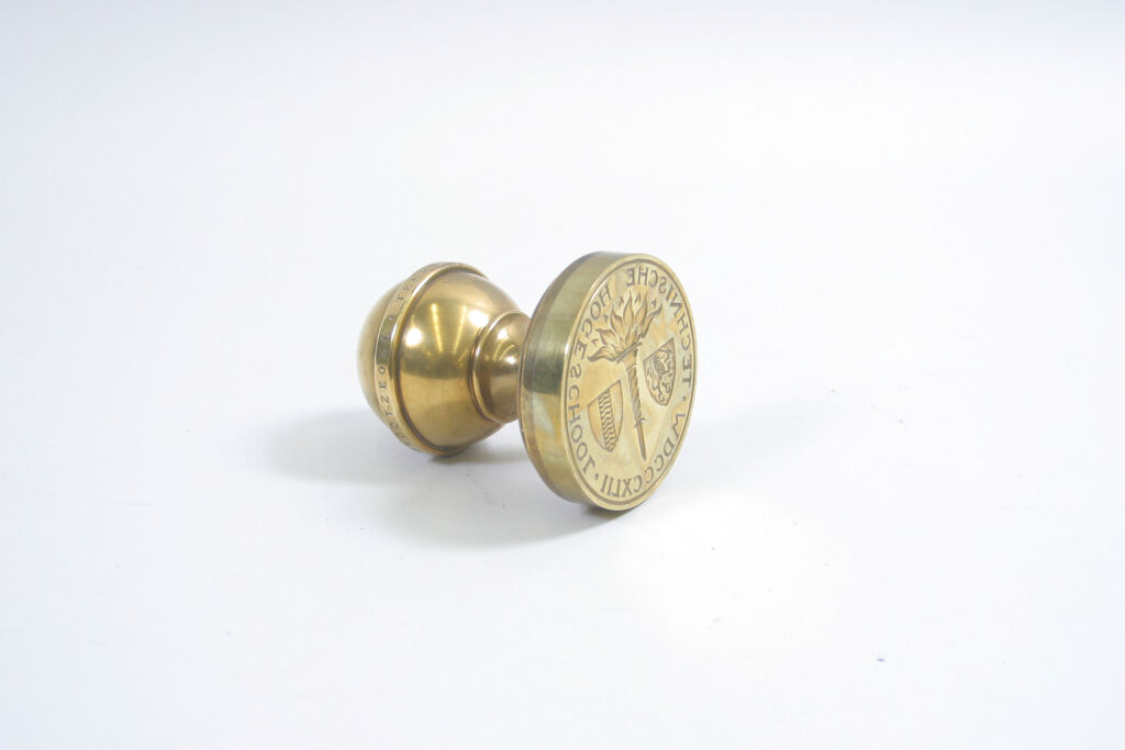 DescriptionStempel van het grootzegel met als zegeltekst in het rond "Technische Hogeschool MDCCCXLII" (1842). Daarbinnen een fakkel, het wapen van het Koninkrijk der Nederlanden en het wapen van Delft. De fakkel verwijst naar Prometheus, een Griekse mythologische figuur, die het vuur van de goden stal en het aan de mensen gaf. Het ontwerp is van hoogleraar Ludwig Oswald Wenckebach, hoogleraar boetseren aan de T.H. Delft van 1935 tot 1962.