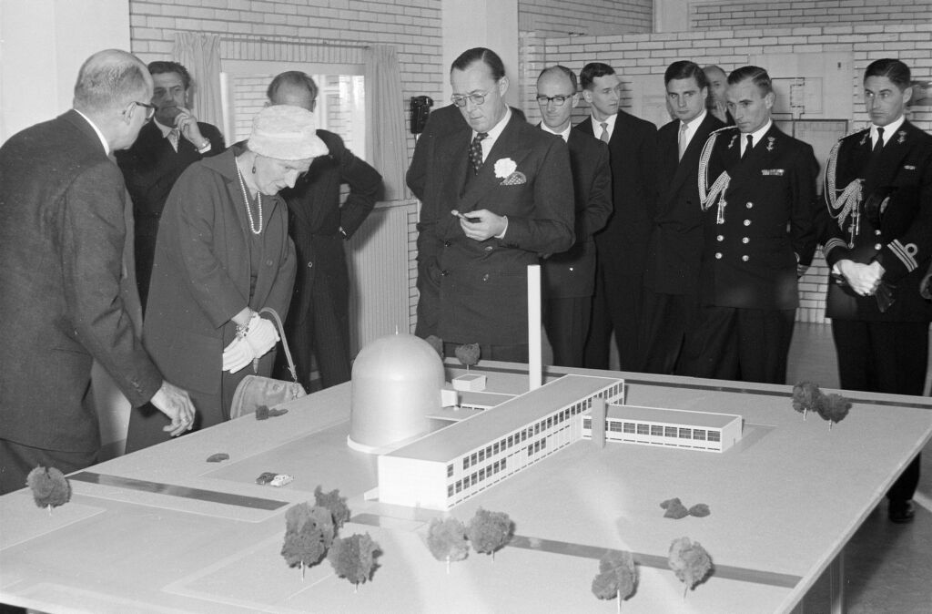 | Beschrijving | Koningin Juliana en Prins Bernhard brachten op 21 november 1958 een bezoek aan de Technische Hogeschool Delft. Er werd onder andere een bezoek gebracht aan het Studentensportcentrum, waar prof.dr. Kronig in de kantine een toelichting gaf op de tekeningen en maquette van de Hoger Onderwijs Reactor, het latere Interfacultair Reactor Instituut (IRI). In november 1958 werd met de bouw van deze reactor begonnen. |