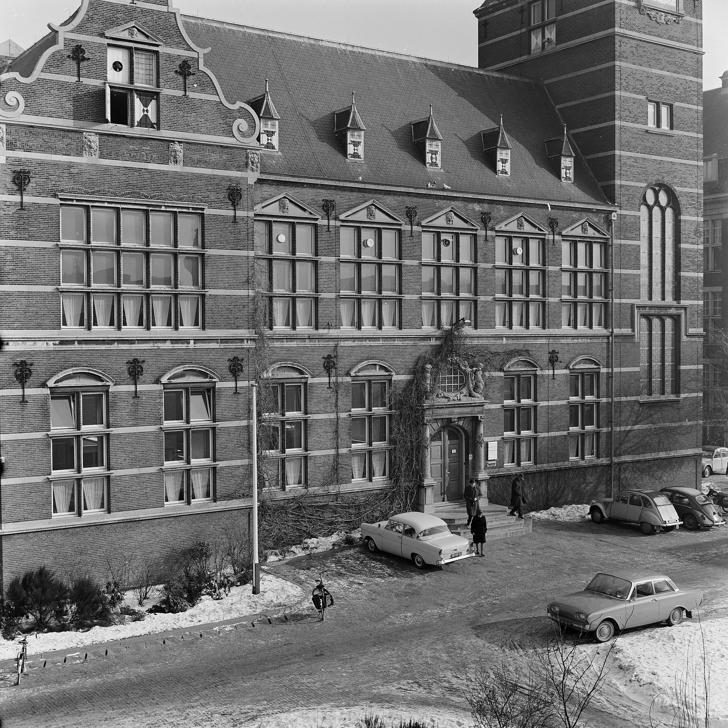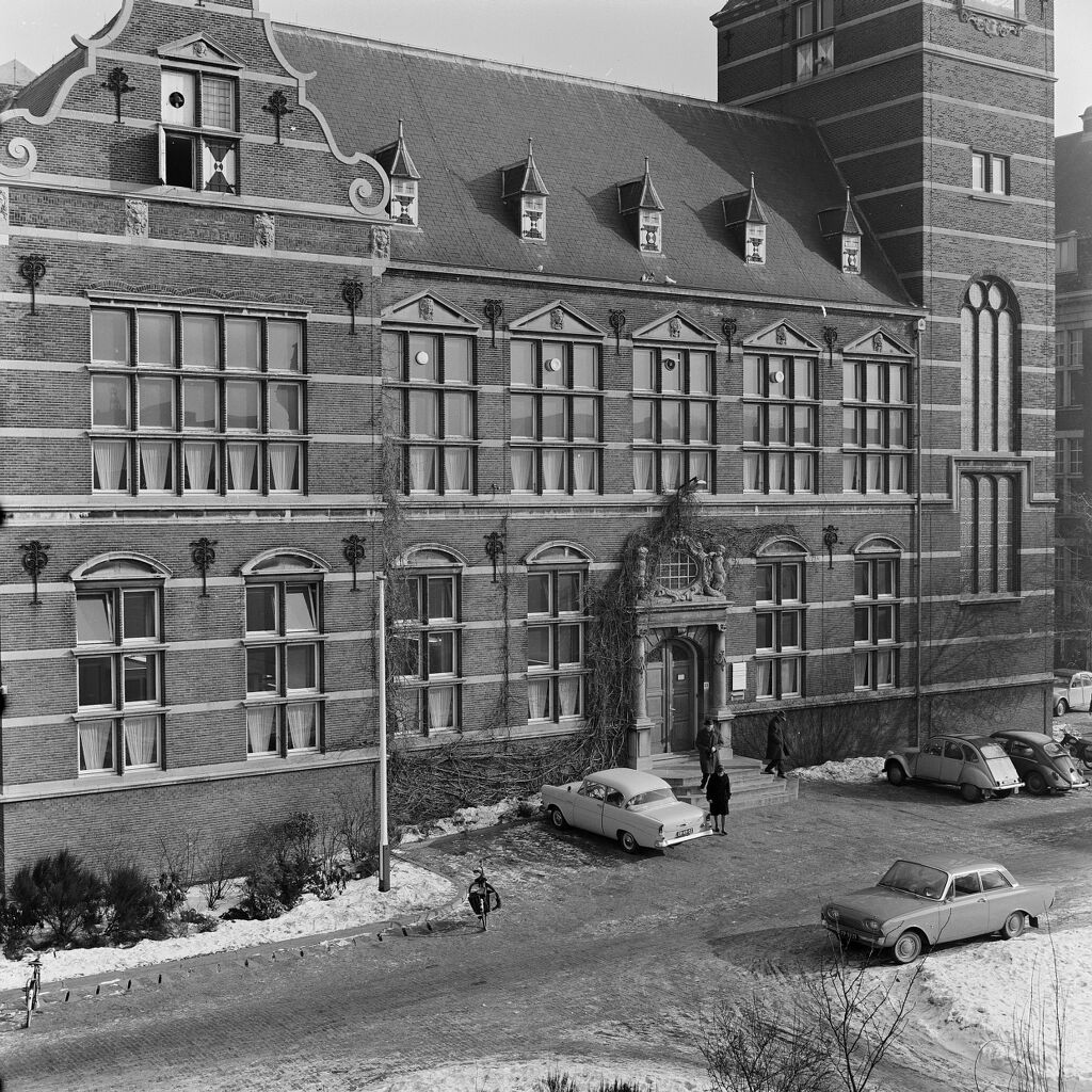 | Beschrijving | Gevel en ingang van de Bibliotheek TH aan de Doelenstraat 101, gefotografeerd vanuit de woning van de congierge en gebouwbeheerder, van de Bibliotheek. Jaar 1962 is geschat. |