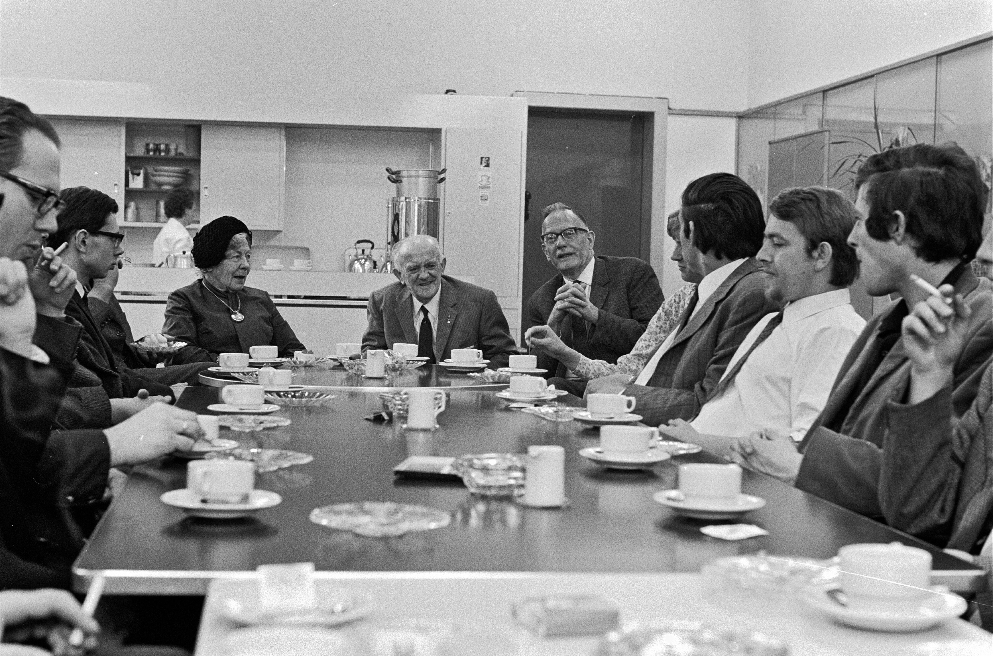 | Titel | Vereniging van Gepensioneerden van de Technische Hogeschool Delft aan de koffie met medewerkers in kantine bibliotheek van de TU Delft (2) |