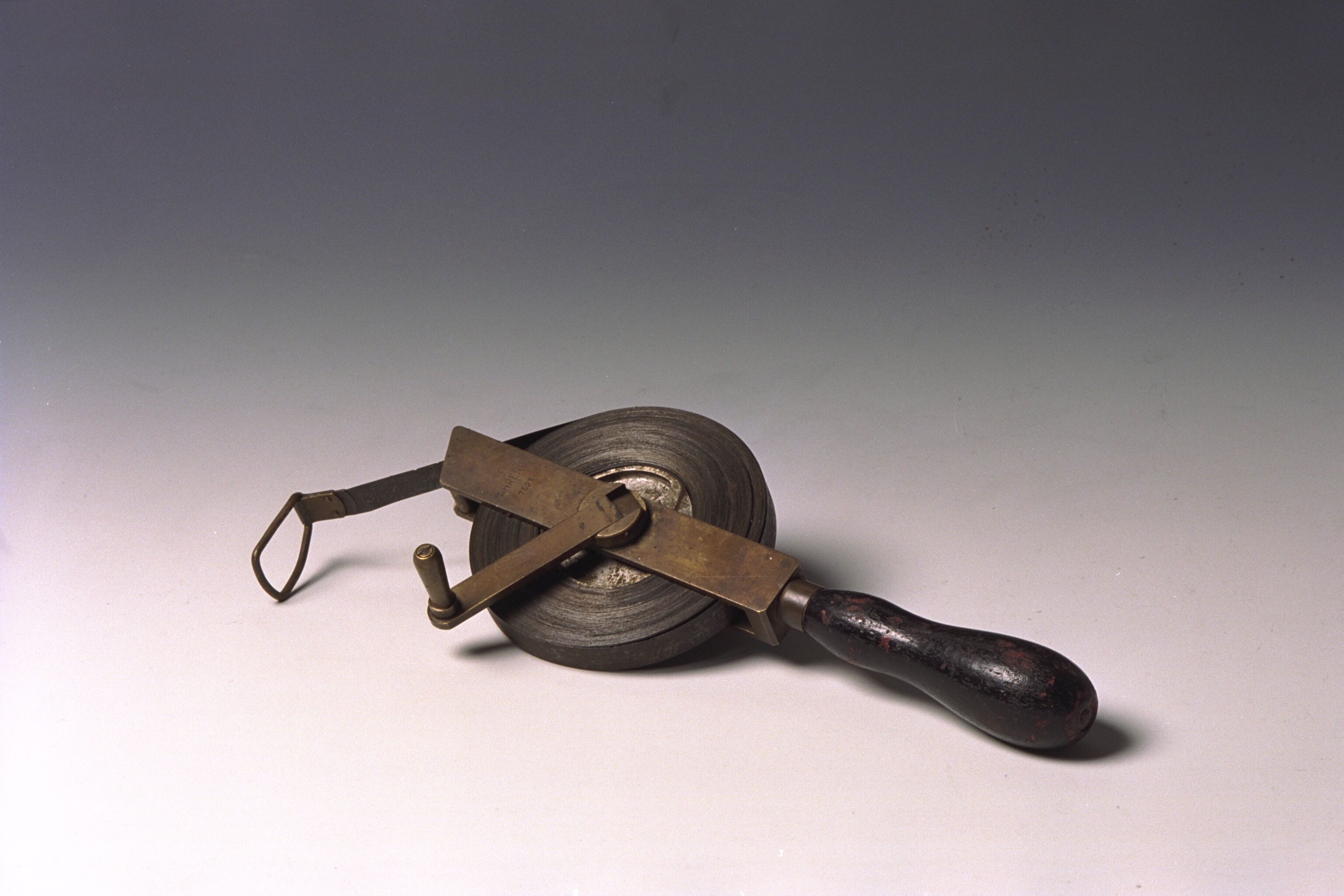| Description | Stalen meetlint door J. Ahrend & Zn, met centimeter verdeling en voorzien van een houten handvat. Geodetisch meetinstrument voor detailmeting. |