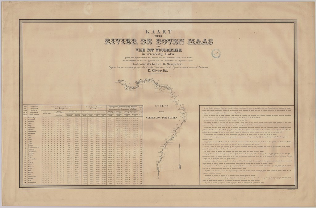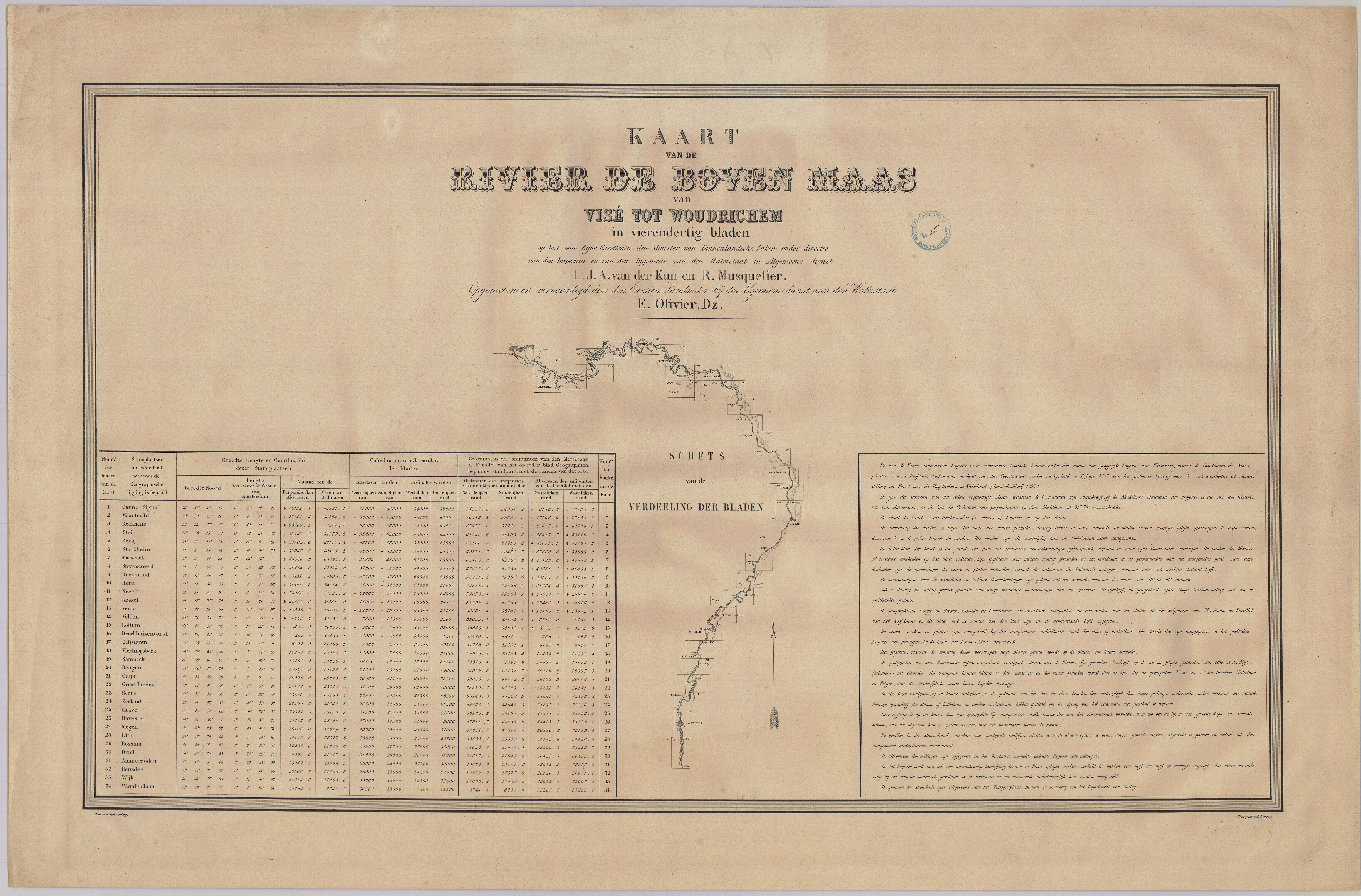 TitleKaart van de rivier de Boven Maas van Vise tot Woudrichem : in vierendertig bladen / opgemeten en vervaardigd door den eersten landmeter bij de Algemeene dienst van den Waterstaat E. Olivier Dz. ; op last van zijne excellentie den minister van Binnenlandsche Zaken, onder directie van den fungerenden Hoofd-Ingenieur en van den Ingenieur in Algemeene Dienst van den Waterstaat L.J.A. van der Kun en R. Musquetier.– Schaal 1:10.000. - [Delft] : Algemeene Dienst van den Waterstaat, 1849-1856 ([Delft] : Topographisch Bureau en Drukkerij van het Departement van Oorlog). – 1 serie in 38 bladen : lithografie; diverse formaten.