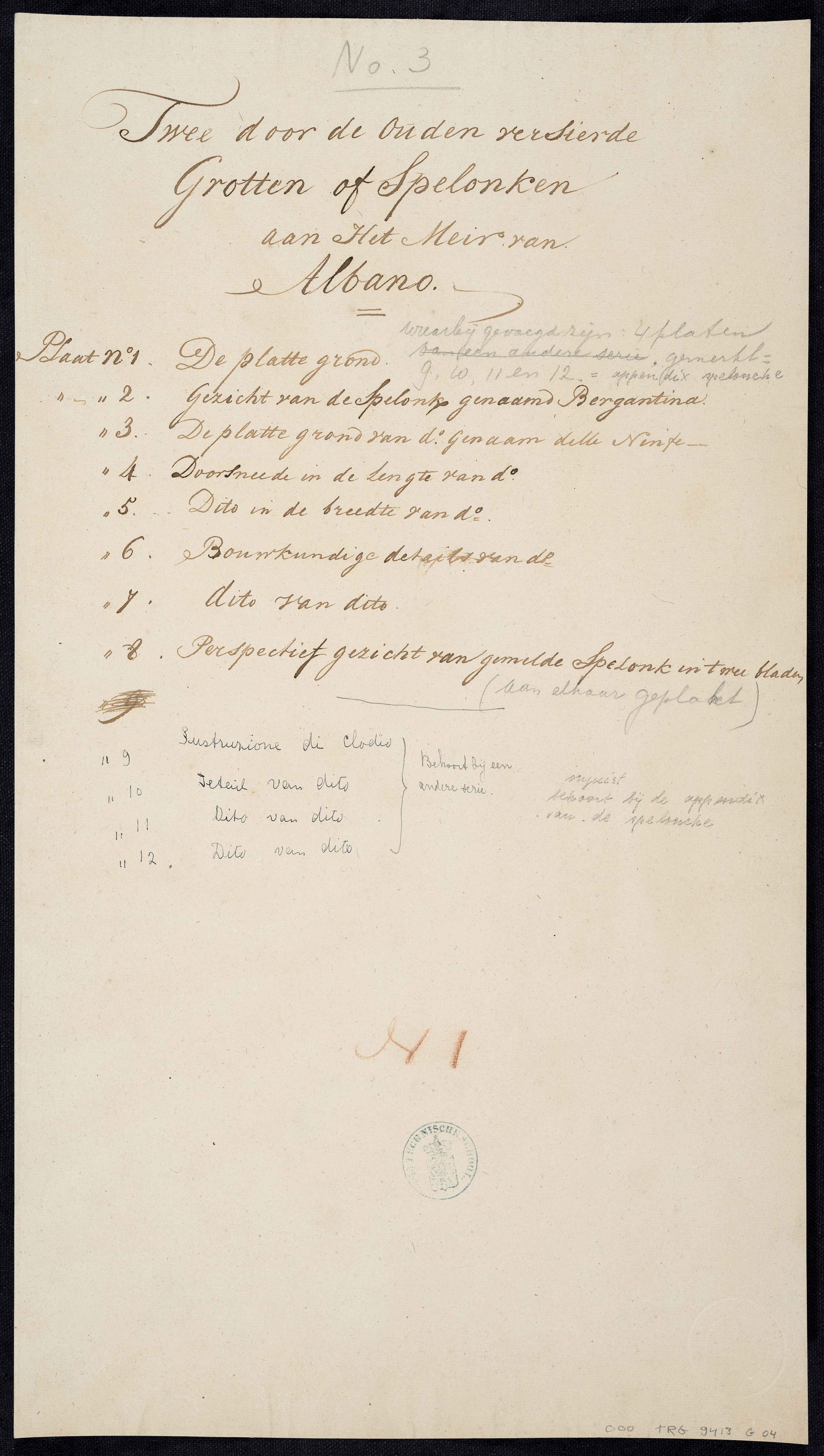| Notes | Illustraties zijn uit de band verwijderd, alleen de tekst zit nog in de band, samen met de teksten van: Antichita d'Albano e di Castel Gandolfo descritte edd incise da Giovan Battista Piranesi. - [Roma, 1764]; en: Descrizione e disegno dell'Emissario del Lago Albano / Giovan Battista Piranesi. - [Roma, 1762] |